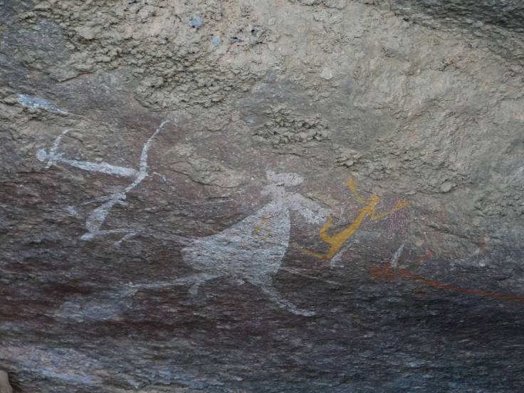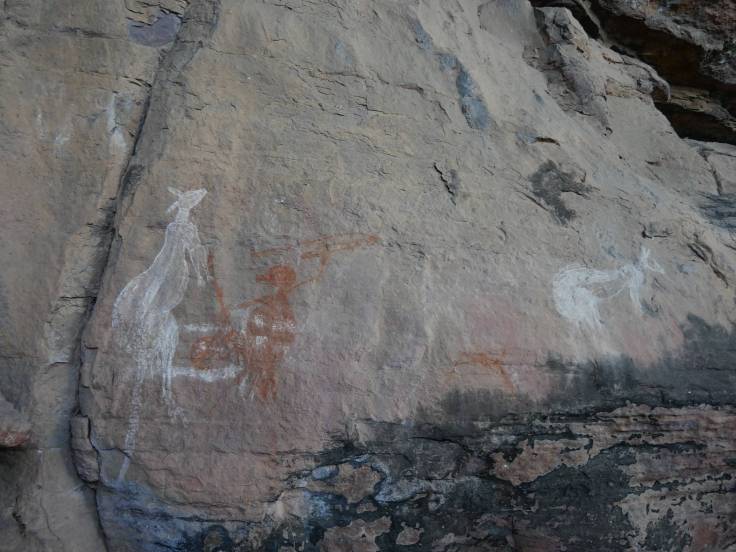 Pour terminer cette « intense » journée, on est allé sur le site de Ubirr. C’est l’endroit le plus connu où l’on peut voir des peintures aborigènes. Il y avait tout un tas de peintures aborigènes. Les aborigènes peignaient des souvent des animaux en croyance à des sacrifices ou des prises exceptionnelles. Des fois, on est tout de même en droit de se demander comment les scientifiques ont pu en déduire ce qui était peint. On ne voit presque rien !