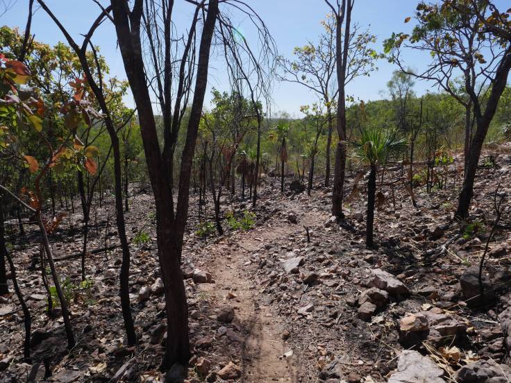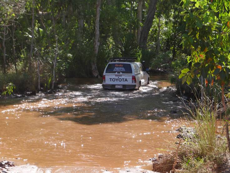 On nettoie rapidement nos vêtements, et on file en direction de Tjaynera Falls. Pour y arriver, c’est un peu le parcours du combattant. Il faut franchir une grosse rivière, avec au moins 60cm d’eau, au bons souvenirs de la Deep Water Crossing de El Questro, puis rouler dans le BUSH sur 10km et terminer par une randonnée de 2km dans la forêt, le sable et les rochers.