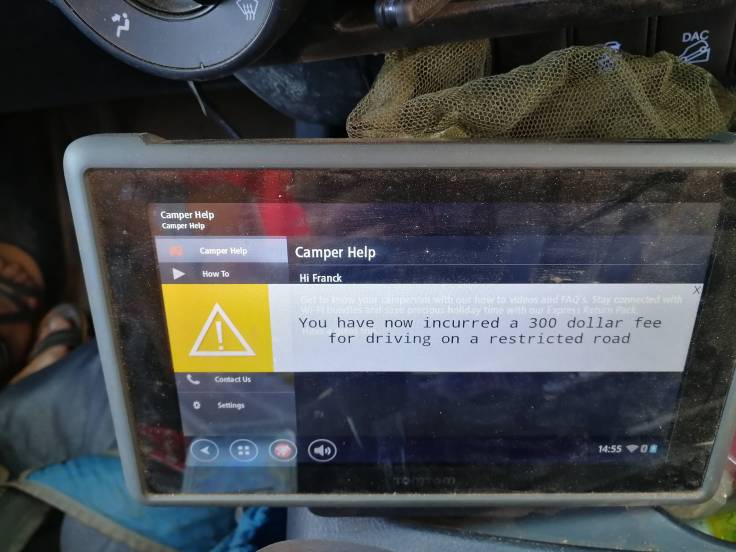Après, on est allé sur la route de « Lost City« , où il y a environ 10km de « off-road ». Au bout de quelques mètres, le GPS de la voiture nous dit « Attention vous empruntez une route interdite, faites demi-tour« . On ne comprend pas trop ce qui se passe et le temps de faire demi tour, un autre message beaucoup moins sympa « Vous allez être débité de 300AUD« !! Non mais c’est quoi ce délire !! On ne pouvait même pas prévenir Britz que finalement on n’avait pas pris la route car on ne captait pas dans ce bled paumé !