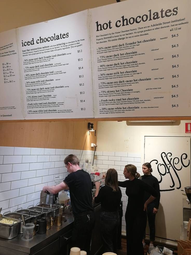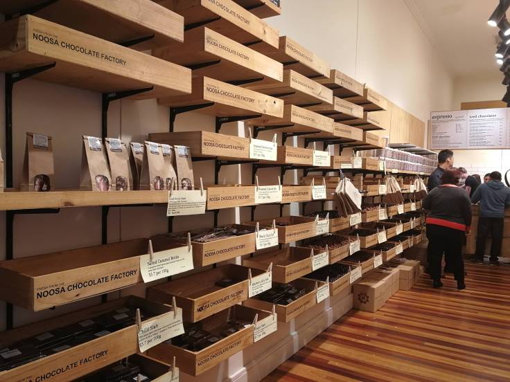 - Noosa boire un bon chocolat chaud, le chocolat est tout frais fait devant vous. Plusieurs sortes du dark au milk et pas cher 4.50 dollars. Il y en a deux sur la même rue, vous le trouverez sur maps.me