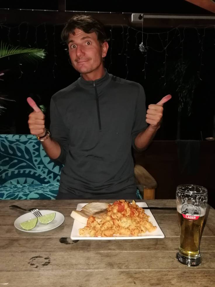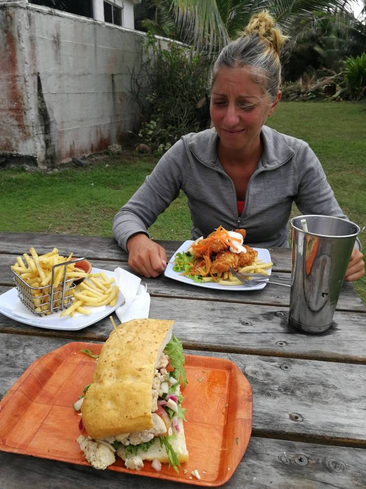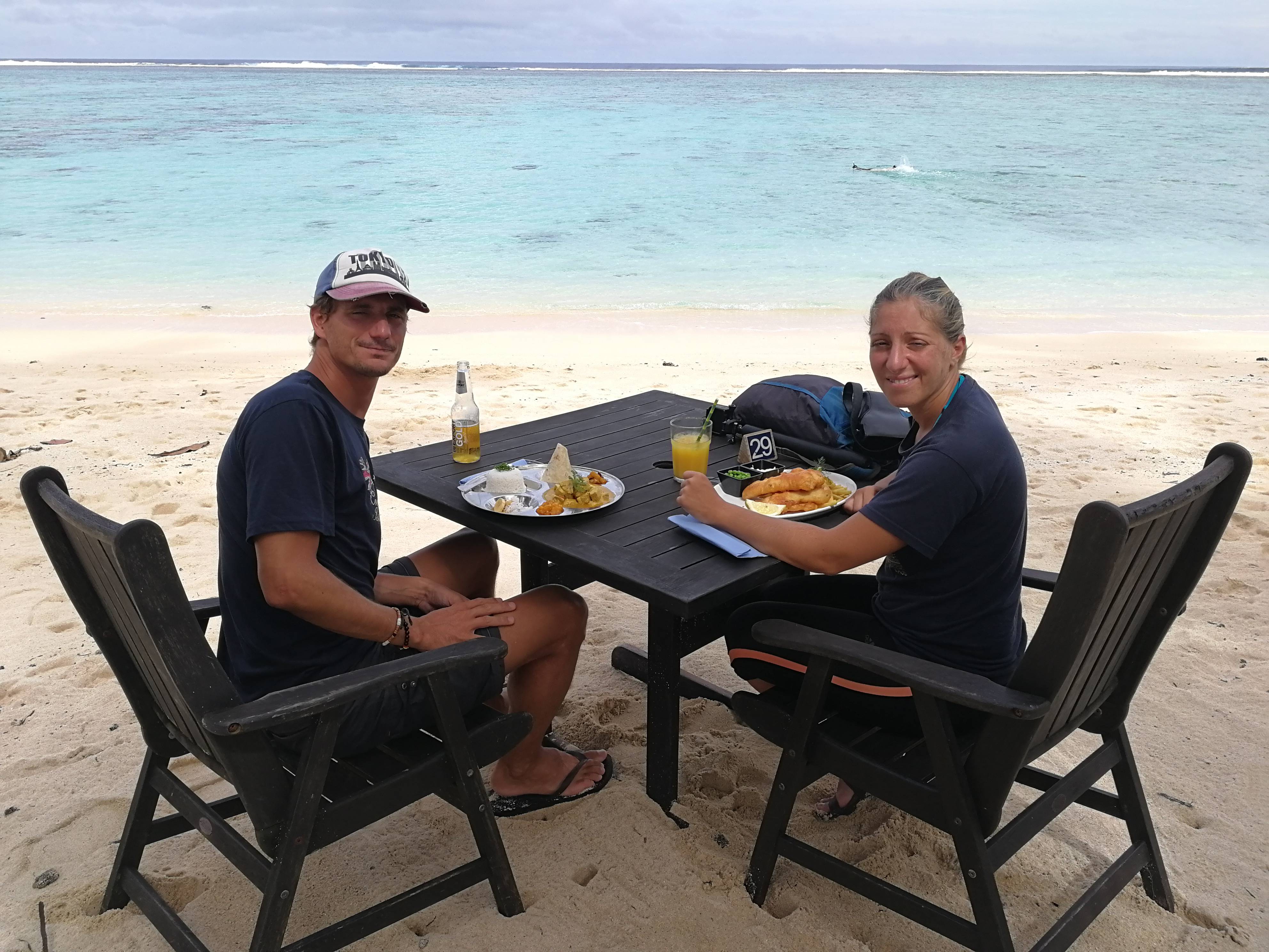 Toutes ces aventures nous ont ouvert l’appétit 🙂 On s’est donc fait plaisir au Vaima Restaurant. Un cadre de rêve pour manger : les pieds dans le sable au bord du lagon. En plus, c’était bon !