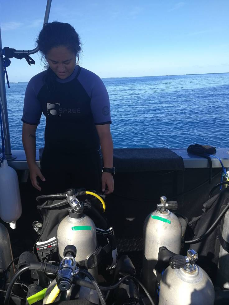 Petite pause chocolat chaud /biscuits et on va en direction du site de Arutanga Passage. Et LA ça déchire ! Des poissons multicolores partout, une bonne visibilité, et surtout deux poissons Napoléon ! C’est assez rare d’en voir. Mais qu’est-ce que c’est beau et gros !! Le temps est passé à toute vitesse ! Une énorme tortue et trois eagle rays ! Bref, c’était royal ! Ça a été super difficile de sortir de l’eau tellement c’était bien 🙂