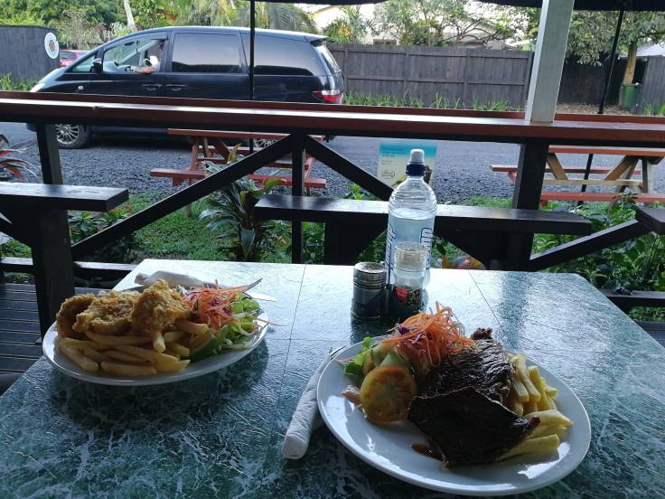 Une bonne sieste au son des vagues s’échouant sur la barrière de corail, et on file manger, dans, je pense, l’un des pires boui-boui de Rarotonga ! Rimas Restaurant. Vue panoramique sur la route, une viande d’une tendresse inouï…des frites pas grasses du tout… Hum un délice ! Une adresse à recommander… Euh à éviter !!!