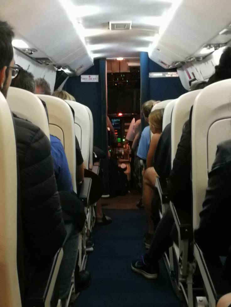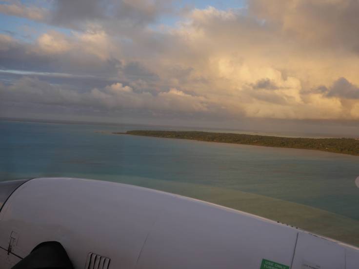 C’est avant même les première lueurs, 5h30, qu’on quitte notre Airbnb, où Odette, notre hôte, nous dépose très gentiment à l’aéroport pour prendre l’avion vers Aitutaki à 6h. Oui oui, on arrive bien juste quelques minutes avant le décollage. Ici, pas de check-in, pas de contrôle de sécurité. On n’a même pas donné notre nom !! Trop bien ! Ça, c’était avant qu’on nous dise que l’on ne pouvait pas prendre nos deux gros sacs car trop gros. Gloups. Après avoir insisté un peu, on a réussi à en prendre un. Ouf. Pour l’autre, bah faudra payer 52 dollars, et il sera dans le prochain avion, 2h plus tard, où on l’attendra à l’aéroport. C’est à bord d’un cou-cou qu’on embarque, 15 places. On espérait voir l’île de Aitutaki de l’avion mais vu qu’on est rentré en dernier, pas de hublot… 😦
