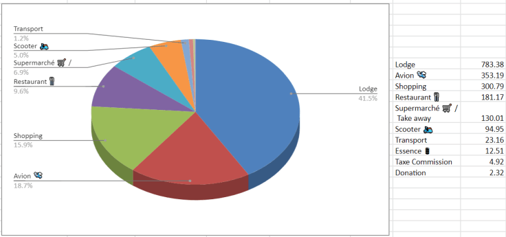 La vie n’est pas si cher pour une île perdue au milieu du Pacifique. Il faut compter entre 70 et 90e par nuit, pour un endroit convenable. Bien sûr, les resorts sont bien plus chers. Pour manger, on trouve des sandwichs ou barquettes à 15 dollars. Les restaurants sont un peu plus chers, environ 30 dollars le plat, mais c’est en général assez bon. La location de scooter nous aura coûter 20 dollars par jour. Il n’y a que l’avion aller retour vers Aitutaki qui a coûté un peu cher, 170e /personne. La plongée à Aitutaki était à 170 dollars, ce qui est raisonnable. Et l’excursion à la journée, qui était sympa mais sans plus, était à 75 euros / personne. Au final, on est plutôt content car on s’en tire avec un solde positif d’environ 550 euros. Cela fait donc environ 79 euros/ jour/personne.