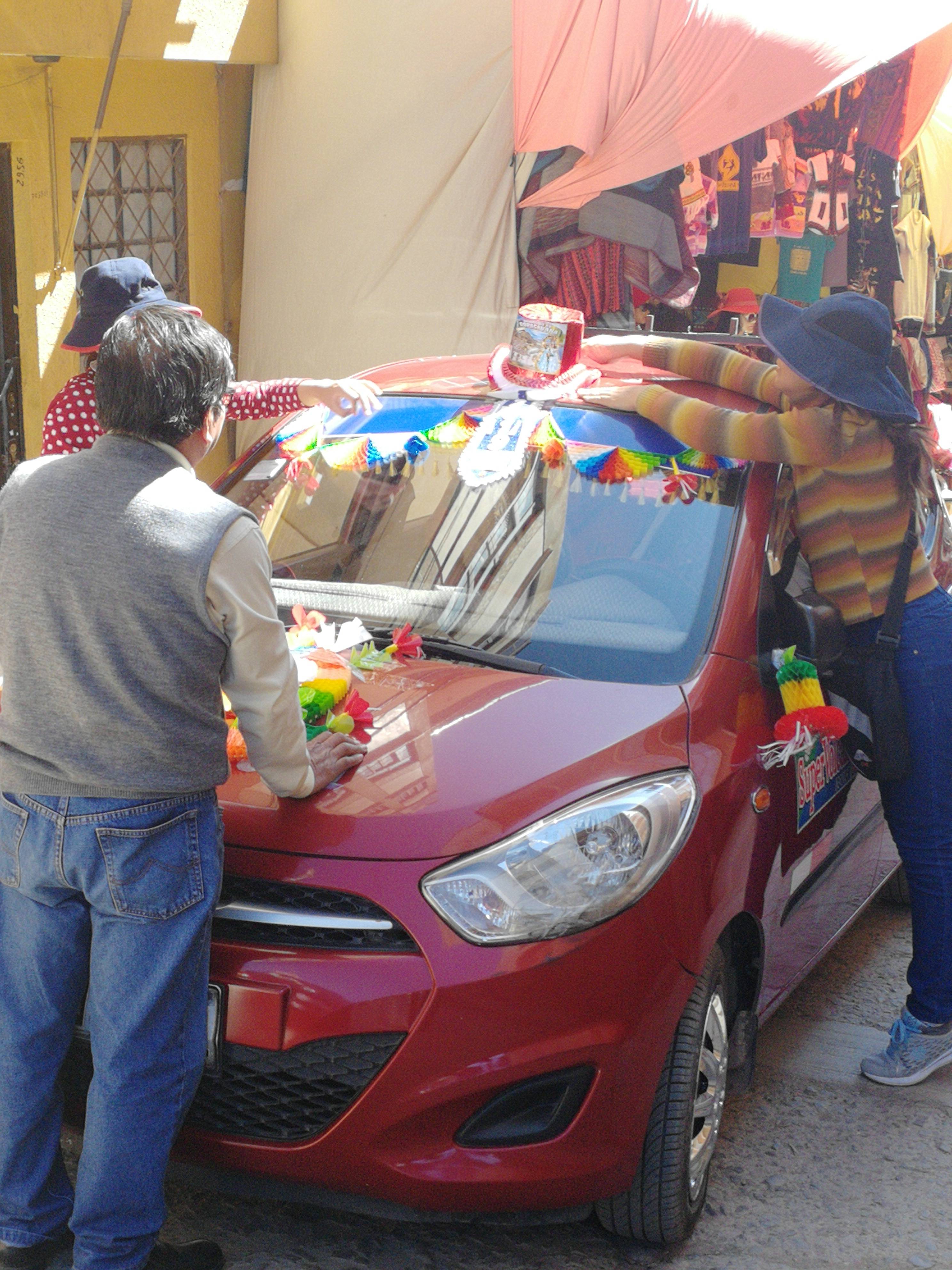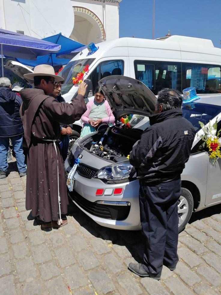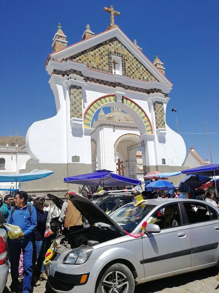 Ce n’est donc pas à 13h mais à 15h que l’on arrive dans le centre ville de Copacabana. Du coup, on arrive trop tard pour la cérémonie un peu spéciale. A 10h, 12h et 14h, un prêtre béni le moteur des voitures des habitants en y jetant du cidre ou de la bière dessus ! Non mais ils sont tombés sur la tête ! Quel dommage d’avoir raté ce rituel. On a juste assisté à la décoration des voitures.