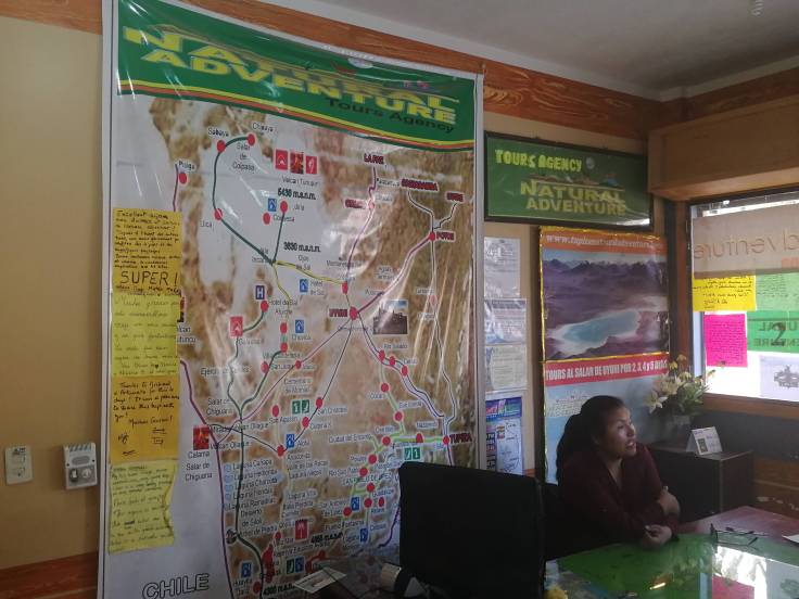 On a bien dû passer 1h dans l’agence Alexandro Adventure Travel à écouter les explications de la conseillère. On souhaitait initialement faire l’excursion du Salar de Uyuni et en plus l’ascension du volcan Licancabur. Mais elle nous a un peu refroidi. En effet, elle nous dit que le guide spécial que l’on devra prendre pour le volcan n’est pas un professionnel et il est désagréable (on avait également lu cela sur quelques blogs). Du coup, vu que l’on va tout de même monter à 5950m, on a envie que le guide prenne soin de nous si on n’est pas bien. C’est donc avec regret que l’on fait une croix dessus. Snif.