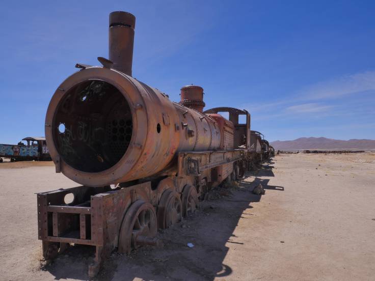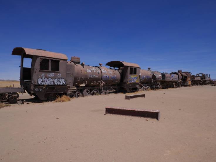 Avant de se quitter, Tito nous a emmené au cimetière des trains, qui est juste à la sortie de la ville. Tout un tas de vieilles carcasses, datant pour certaines de plus d’un siècle, sont là, au milieu de nulle part et laissées à l’abandon.