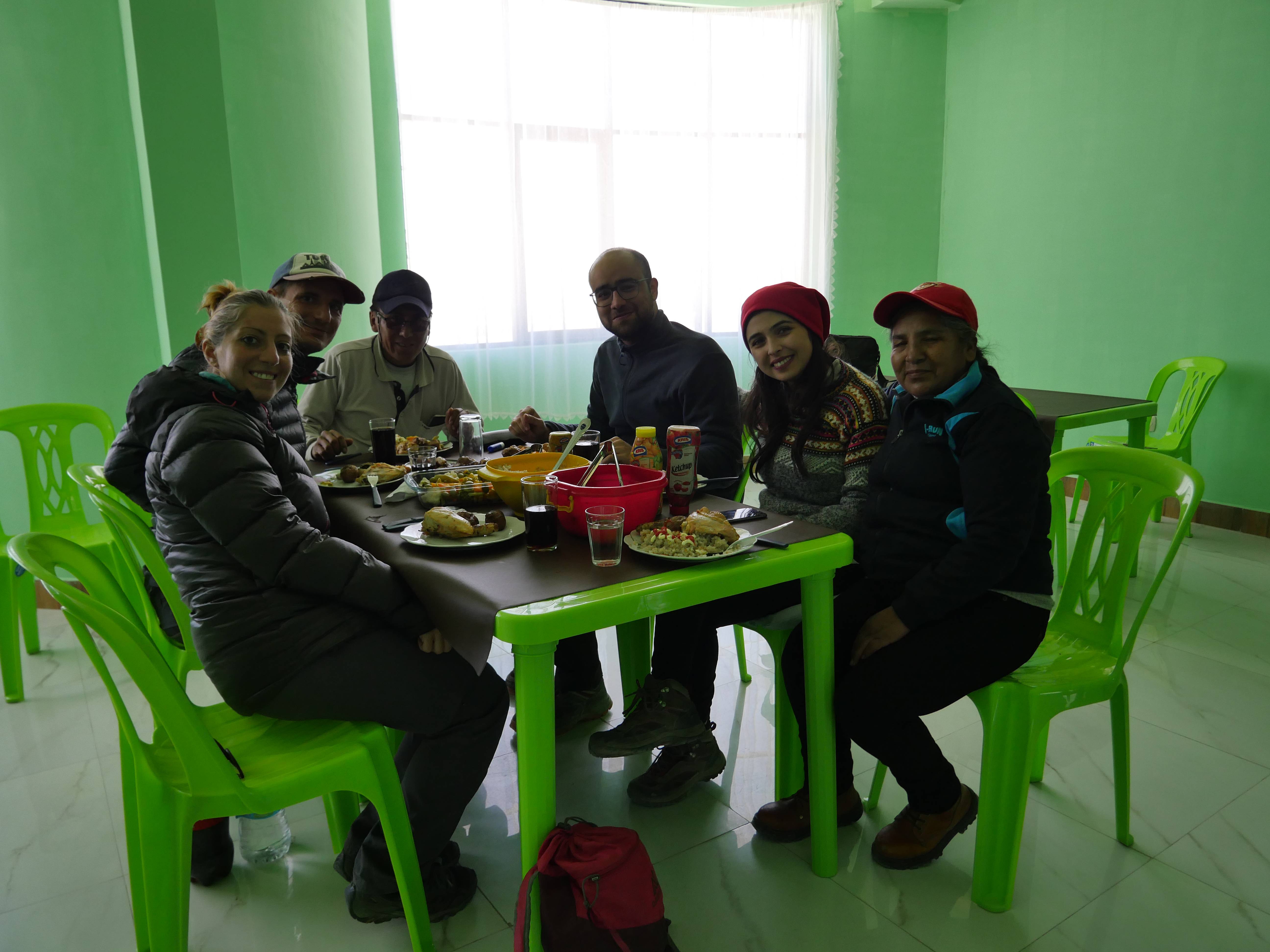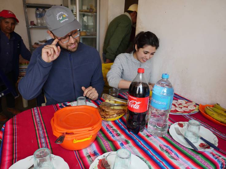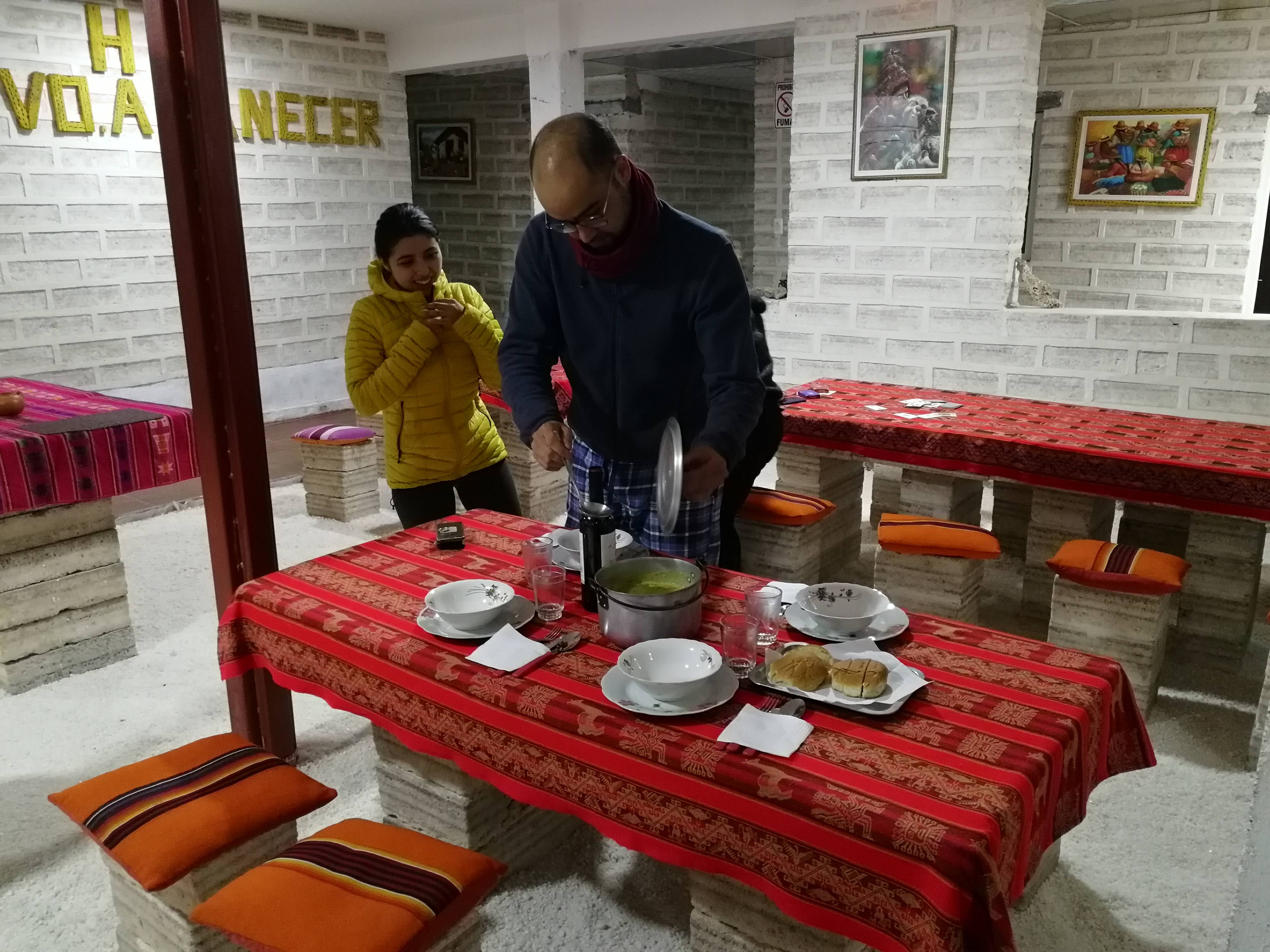 Une fois arrivé « a la casa » dans le village de Villar Mar, on a encore le privilège de choisir notre chambre pour tous les 4. S’en est suivi, un petit thé et gâteaux avant de manger un délicieux plat local, le Piqué Macho. Un mélange de poivrons, oignons, viande, œuf et… frites. Va savoir ce que les frites viennent faire ici ! 🙂 Tito en a profité pour nous raconter quelques histoires sur la Bolivie. Par exemple comment l’Argentine, il y a fort longtemps, a récupéré des territoires de la Bolivie en les échangeant contre des chevaux. Dire qu’auparavant, les régions de Salta et Iguazu faisaient parties de la Bolivie. Il nous a raconté également ce qu’a fait le président Evo pour le pays. Une discussion vraiment très intéressante !