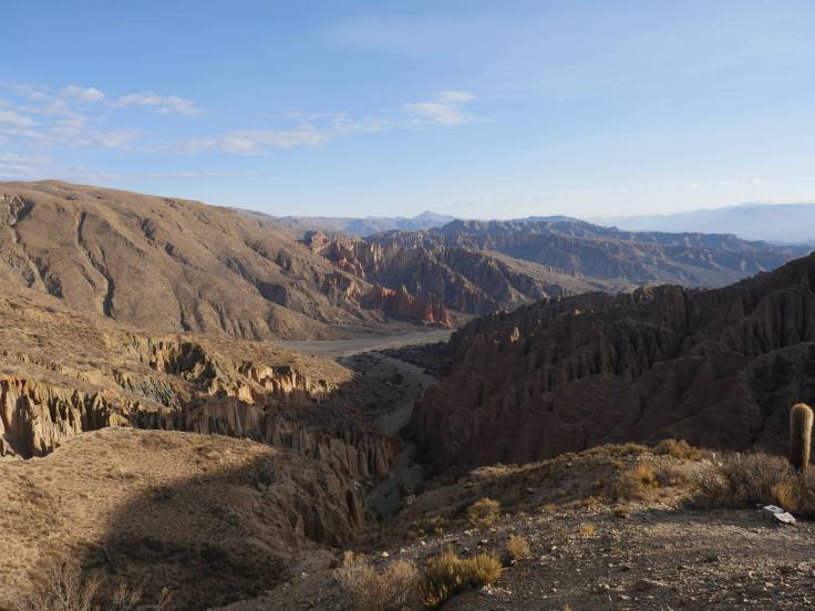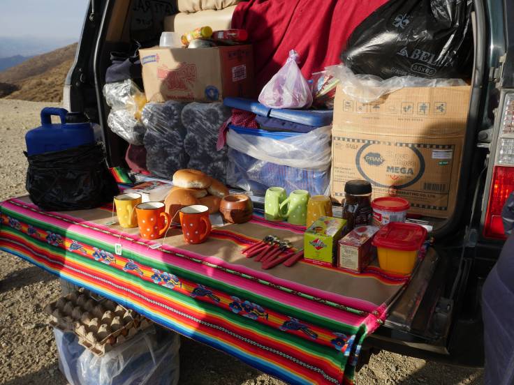 Environ 30min plus tard, on fait une pause pour le petit-déjeuner dans un super cadre ! Ce périple commence vraiment bien ! Un petit thé et une brioche avec vue sur les montagnes et les cactus de El Sillar.