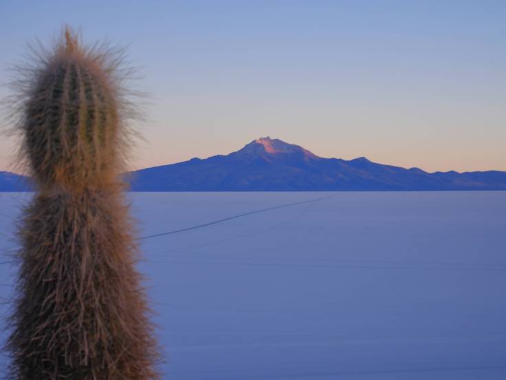 On change donc d’hôtel, qui pour le coup est vraiment mieux, avec une bonne douche chaude !!! A peine le temps de déposer les sacs, que l’on file tous voir le coucher de soleil dans le Salar ! C’était vraiment INCROYABLE comme paysage !! Le désert à perte de vue et la montage Tunupa qui culmine à 5432m !
