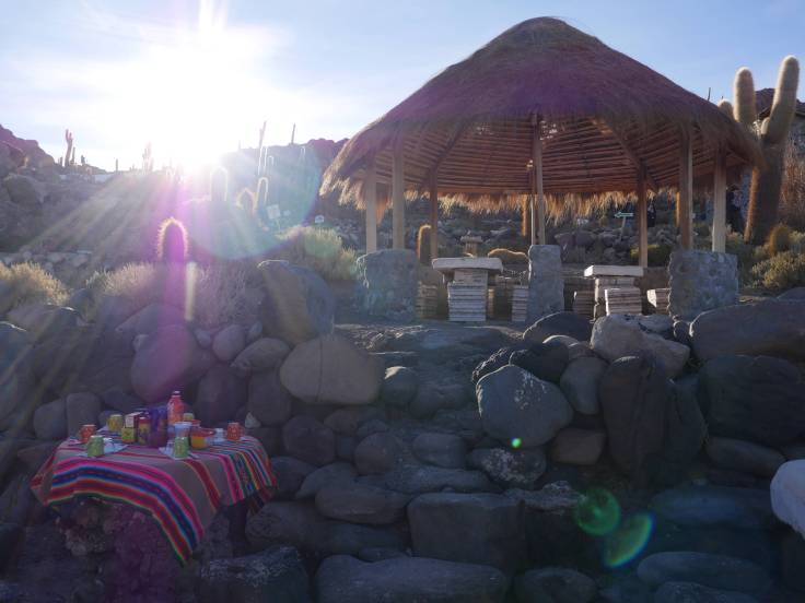 On retourne ensuite au 4×4 pour prendre un super petit-déjeuner sur une petite table avec le Salar en face. Vraiment très agréable de manger dans le désert !