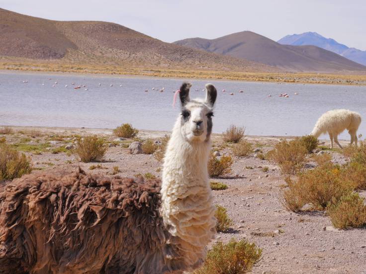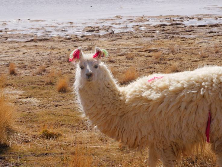 S’en est suivi un petit arrêt à la Laguna Vinto, où on a pu approcher les lamas de très près. La piste est toujours des plus difficiles mais le paysage est vraiment super beau et le temps passe vite.