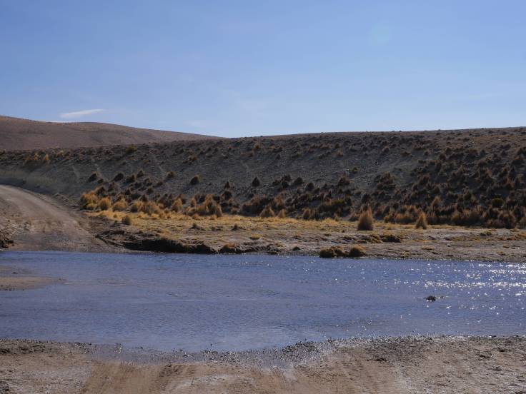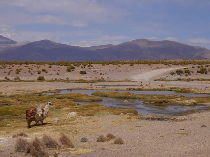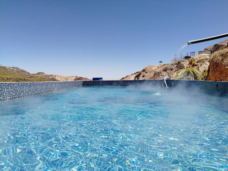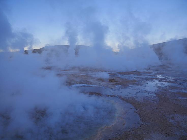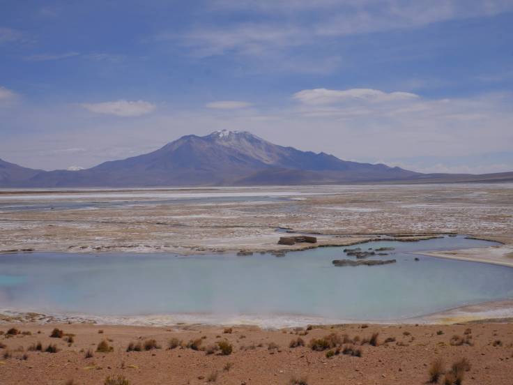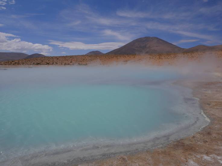 Ce site thermal est situé à 4100m d’altitude et l’eau, qui arrive à 62 degrés, provient du volcan Taapaca, quelques kilomètres plus loin.