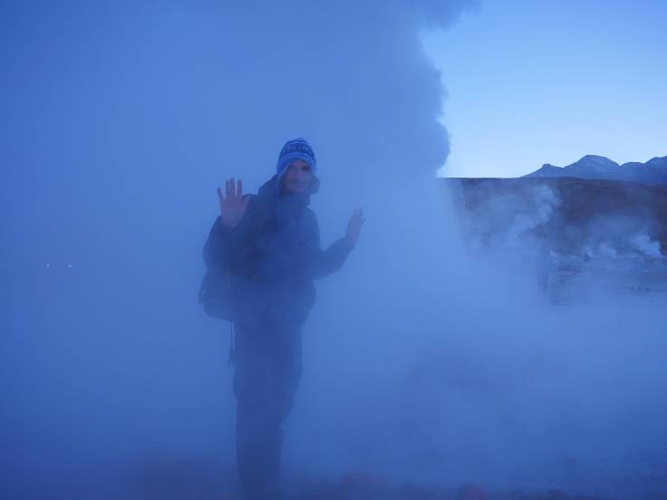 De la fumée qui sort en continue des profondeurs de la Terre, à plus de 10m de hauteur. Il doit faire super chaud en dessous, l’eau est à presque 90 degrés, mais en surface il CAILLE !!!!! On est à 4300m d’altitude et il doit faire entre moins 20 et moins 15 degrés !! Et on n’est pas du tout équipé pour supporter ce froid polaire ! On essaye de se réchauffer comme on peut mais dès qu’il faut prendre une photo, on est obligé de sortir les mains de nos poches. GLAGLAGLA !!!