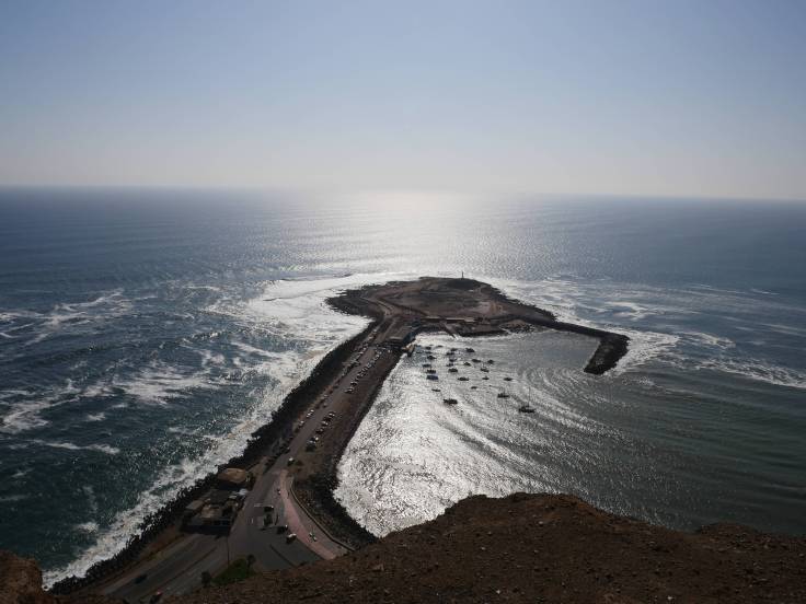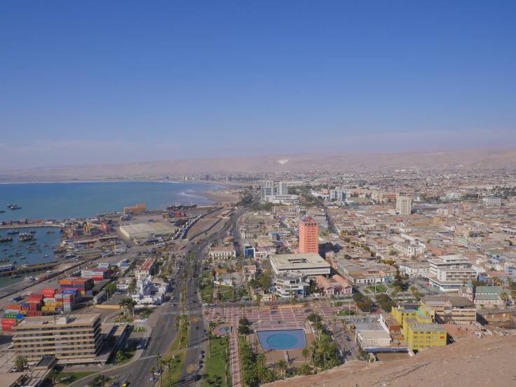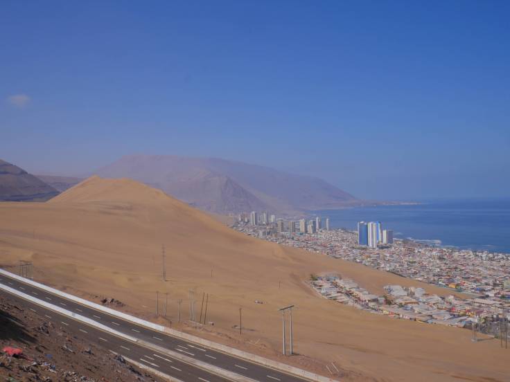 Après quelques bouchons à cause de travaux, hé oui même dans le désert il y a des gens qui travaillent, on aperçoit enfin la ville de Iquique. Et surtout l’océan Pacifique et également une immense dune de sable qui surplomb la ville. Elle est vraiment gigantesque au moins 300 ou 400m de haut !!!!