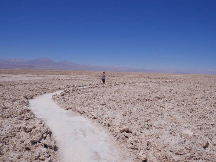 Il est maintenant 15h, et on se dirige vers la Vallée de la Lune. On y verra, avec une immense imagination, « Las tres Mares« . Ensuite, une petite randonnée sans plus d’intérêt à « Mina de la Sal » , avant de voir un SPLENDIDE point de vue sur le mirador Achaches. Mis à part le chemin de sable sur lequel il faut marcher, et qui énervait Ria, c’était vraiment super mega beau ! Ça se passe de commentaire.