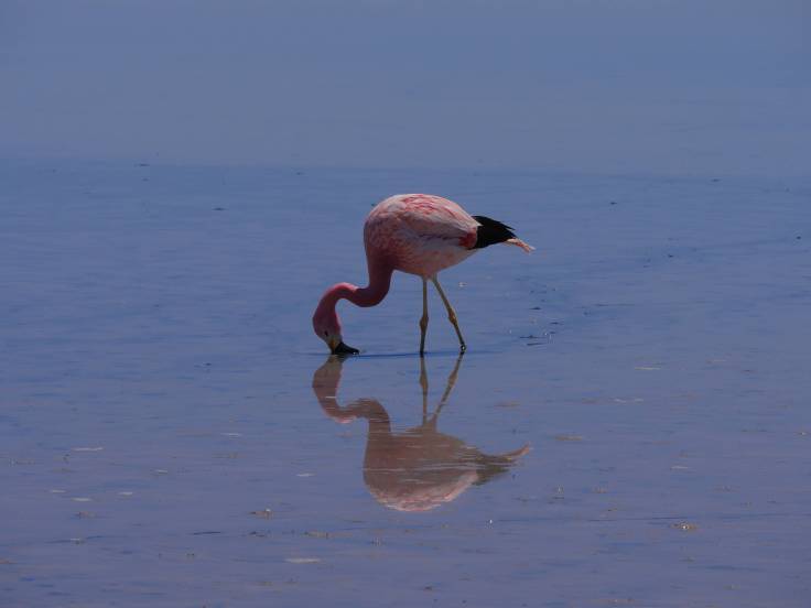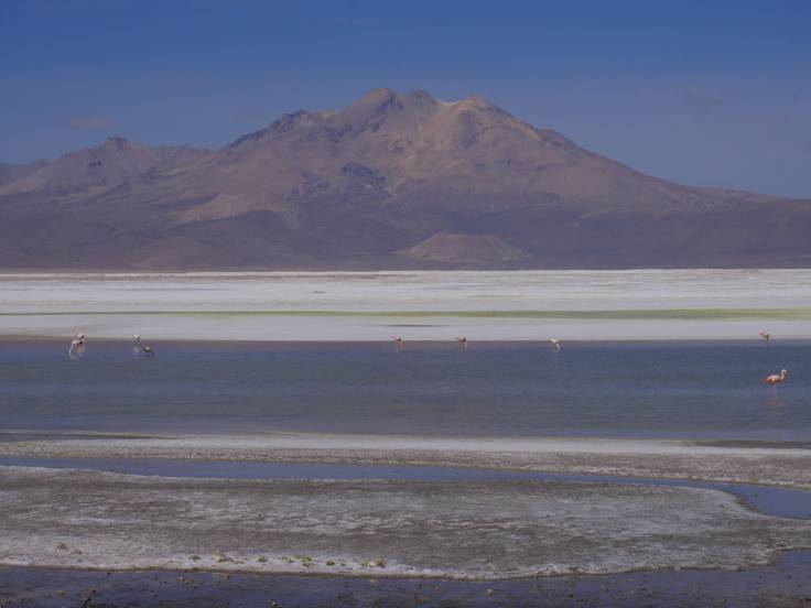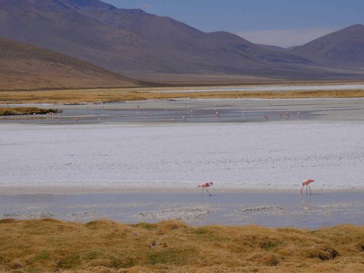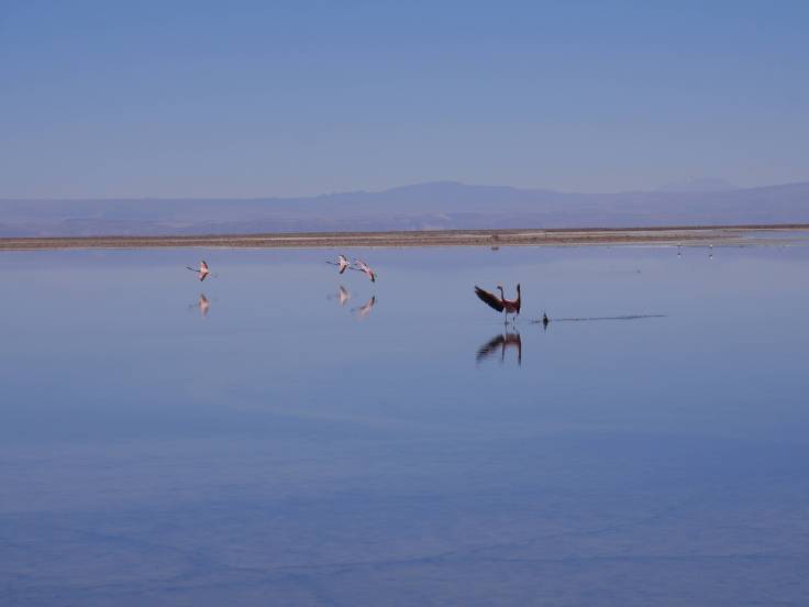 Ensuite, une longuuue route, mais super jolie, nous a mené au sud de San Pedro. Un petit arrêt devant l’église de Toconao et à Quebrada de Jerez, sans trop d’intérêt, avant d’arriver à la Laguna Chaxa, où on a pu y voir beaucoup de flamants roses. L’eau s’est évaporée, il y a fort fort longtemps, et le sel est resté ici et à cristallisé, c’est ce qui donne ce paysage si particulier.