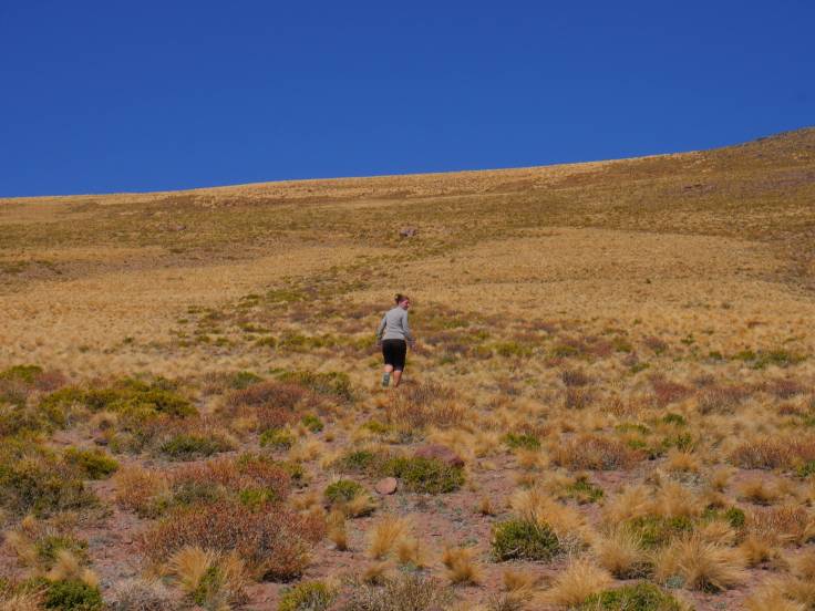 Ensuite, on prend la direction du sud pour arriver aux Lagunes Miscanti et Miniques, qui sont les plus hautes lagunes du Chili. Enfin, arriver est un bien grand mot, car la route pour y accéder était fermée. Mais on ne s’est pas dégonflé, on a pris un minuscule chemin, qui se trouvait un peu plus loin, sur 7km à travers le désert. Heureusement qu’on avait un 4×4 car c’était Space Mountain dans la voiture, ça bougeait de partout !! On se demandait vraiment où on allait. C’était pas le moment d’avoir une panne mécanique… 🙂 Le pire, c’est qu’on est arrivé dans un cul de sac à 3km de l’arrivée. Mais on ne se dégonfle toujours pas, on laisse la voiture au milieu de nulle part, et on grimpe la colline en espérant que l’on pourra voir les deux bassins derrière.