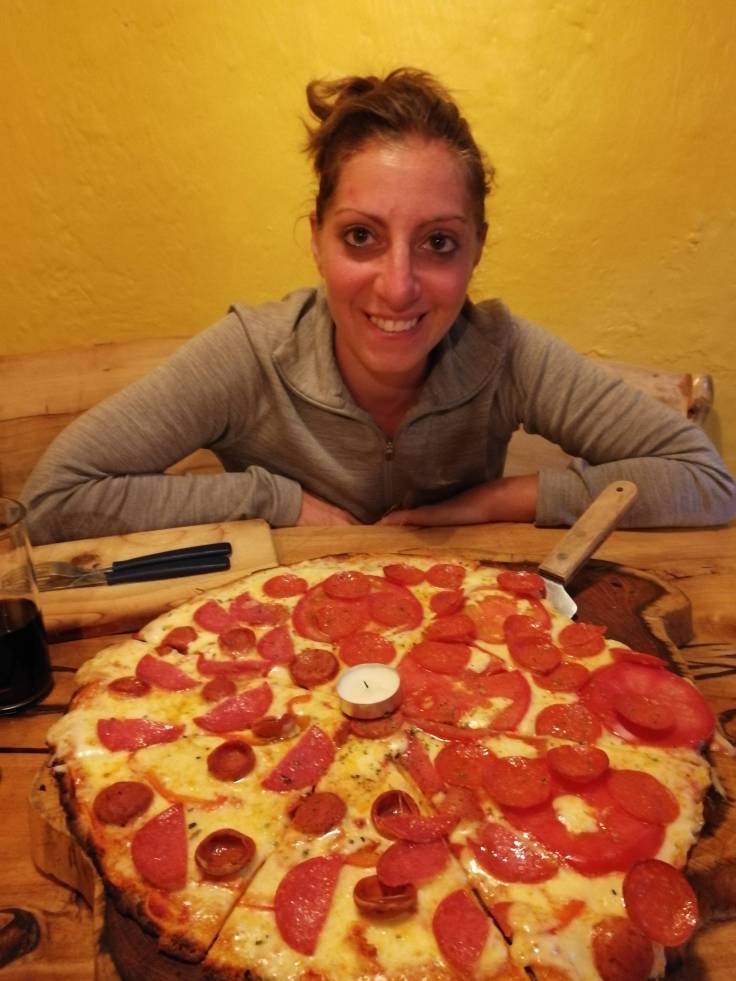 Il était maintenant temps de rentrer. Faire les 160 km qui nous séparent de notre hôtel, prendre une bonne douche, et aller manger une super bonne pizza chez El Charrua. Ria en a profité pour souffler sa bougie sur sa pizza d’anniversaire 🙂