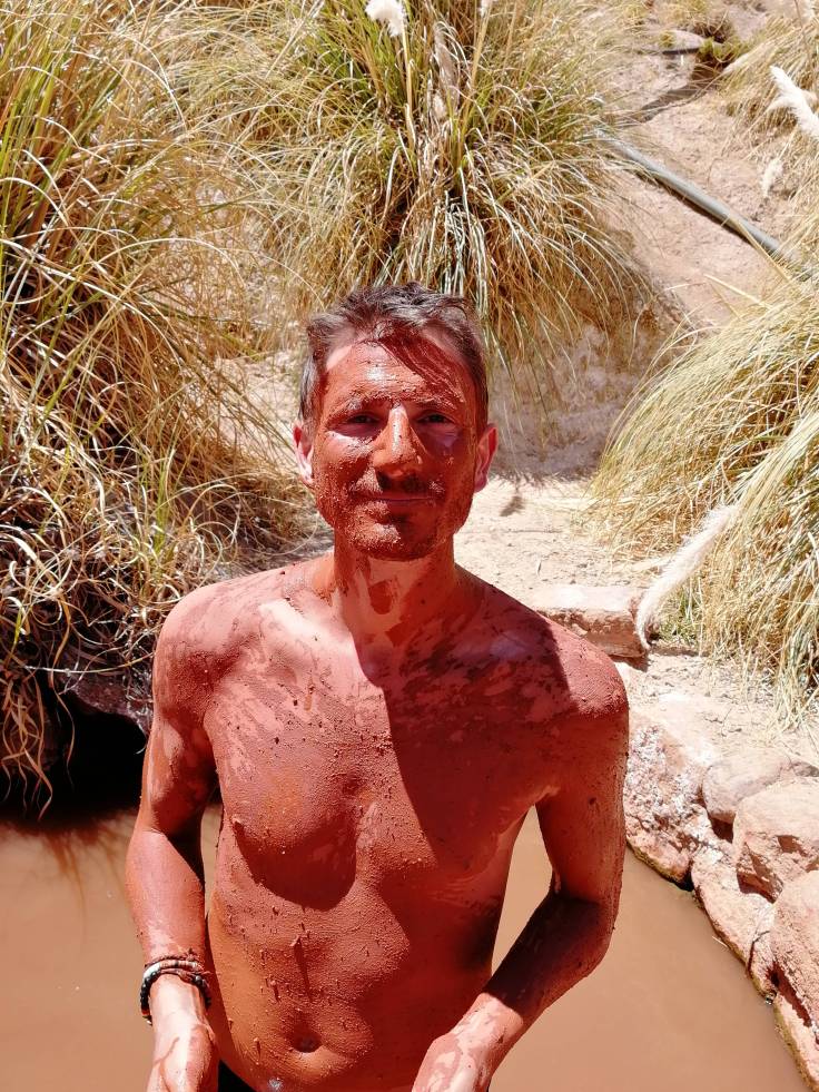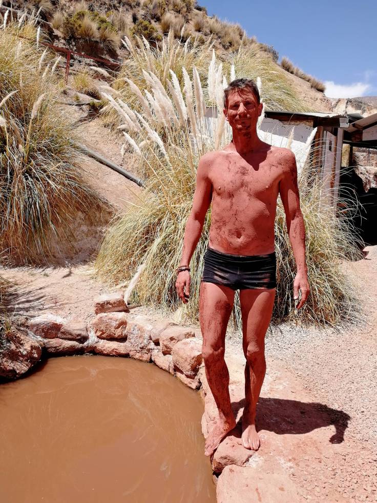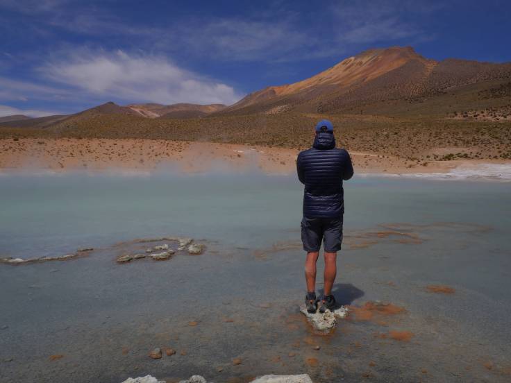 On a pris la route qui fait le tour du Salar et qui permet d’avoir de super points de vue. Une vingtaine de kilomètres plus loin, on arrive aux thermes où on souhaitait se baigner. Euh… Alors oui, c’est mega beau et chaud mais qu’est-ce que ça pue !! C’est dingue ! En plus, il n’y a pas de douche pour se nettoyer, donc pas très envie de conduire pendant des heures avec du souffre sur la peau. Dommage, ça avait l’air super mais on passe notre chemin.