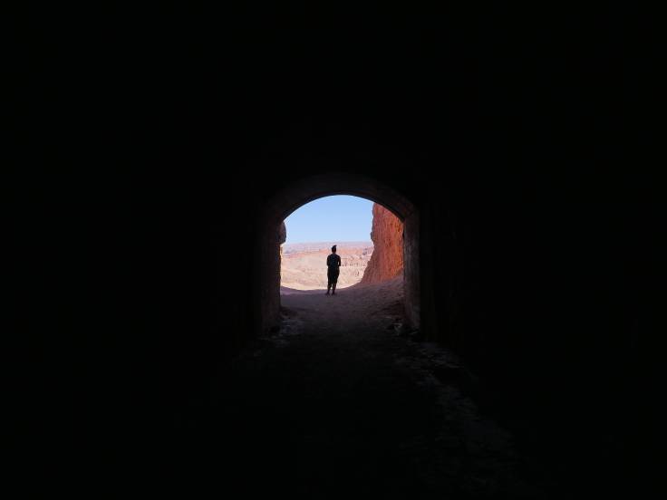 Après une nuit vraiment reposante, mais trop courte pour moi, on se prépare et on prend la direction de « Quebrada del Diablo« , à quelques kilomètres. Le chemin pour y parvenir nous rappelle encore de bons souvenirs sur la Gibb River Road, avec des cailloux, des trous, de l’eau et du sable. On stationne au milieu de nulle part, et on fait, dans un premier temps, la balade pour aller jusqu’au tunnel.