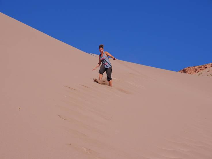 Le mieux n’était pas l’aller, pour grimper en haut de la montagne, mais le retour où on a couru dans les dunes de sables ! C’était top, et en plus, il n’y avait personne. Ria qui maudissait précédemment le sable dans ces chaussures a été servie… 🙂