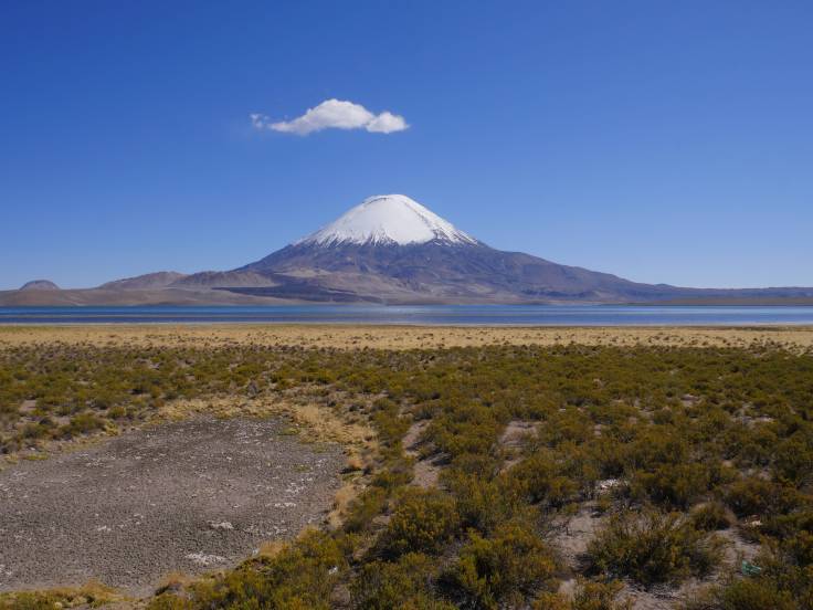 Le lac n’a rien d’extraordinaire mais la montagne qui le domine, le volcan Parinacota, est splendide ! On aurait bien aimé y monter mais culminant à 6348m d’altitude cela n’aurait pas été raisonnable. A y regarder de plus près, il y a une vague ressemblance avec le Mont Fuji au Japon. Juste à côté, il y a son copain, le volcan Pomerade, à 6282m.