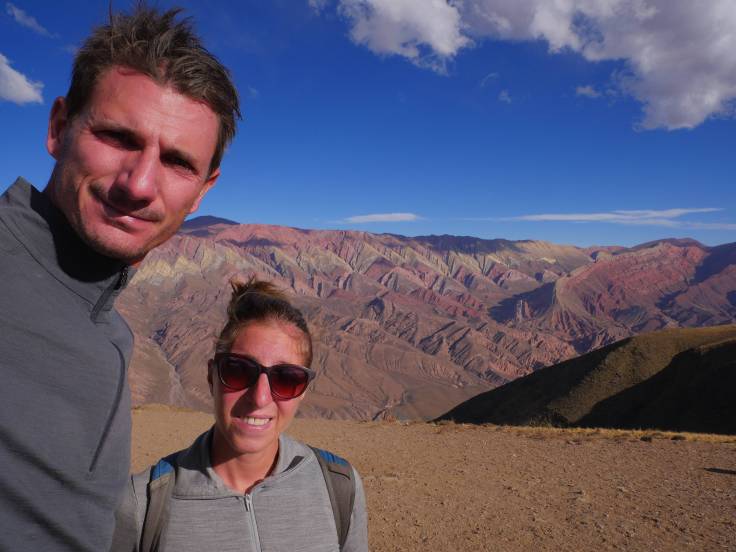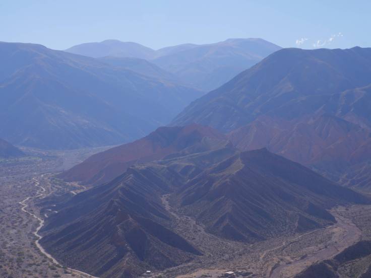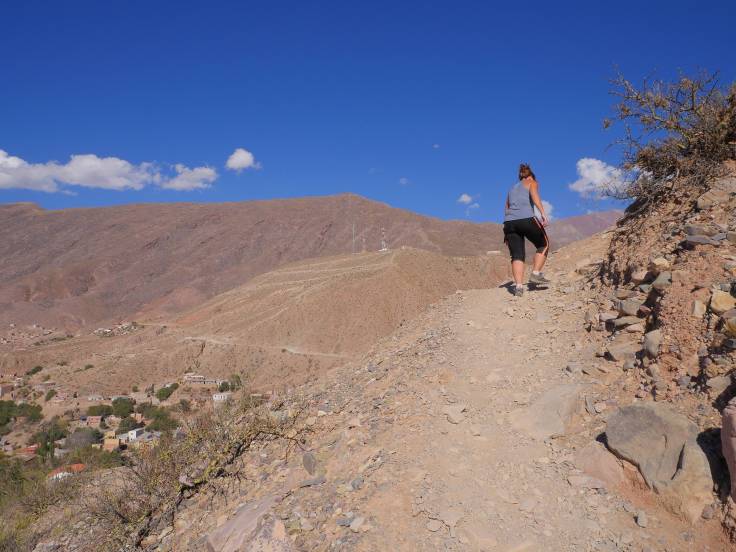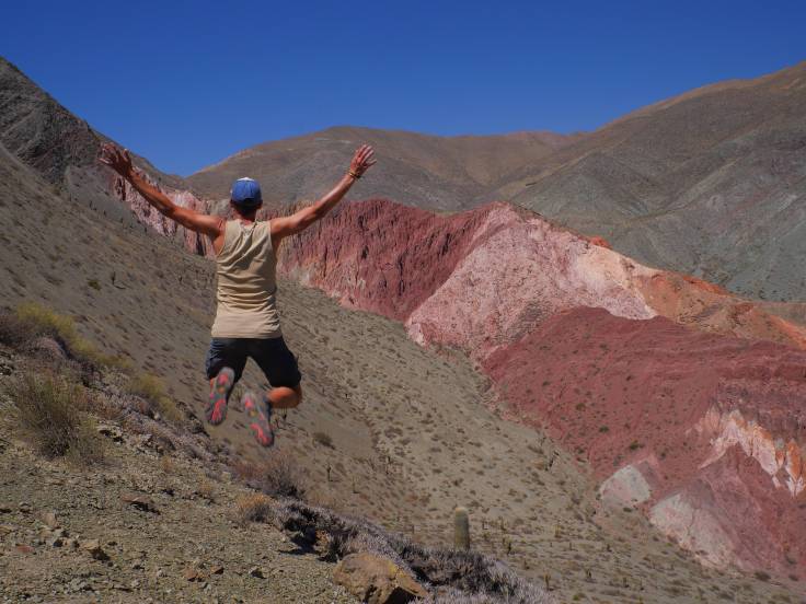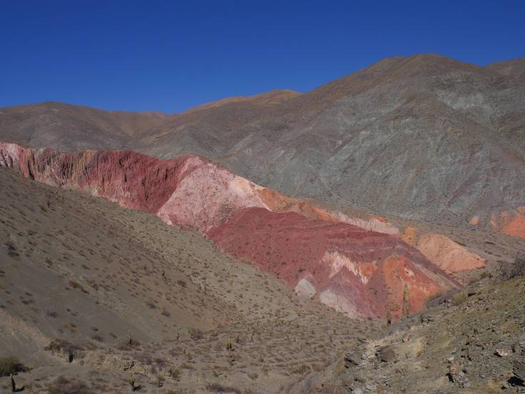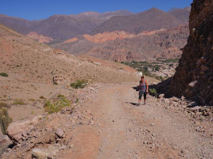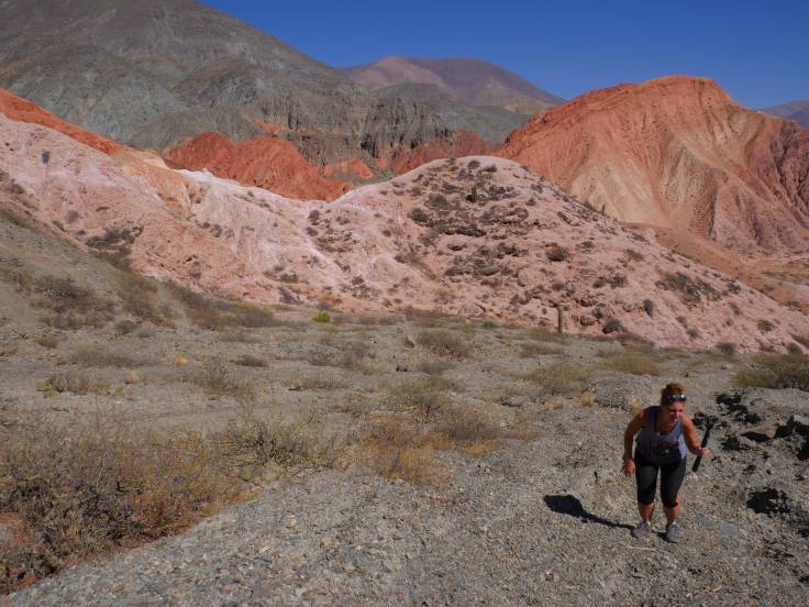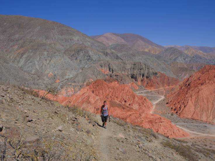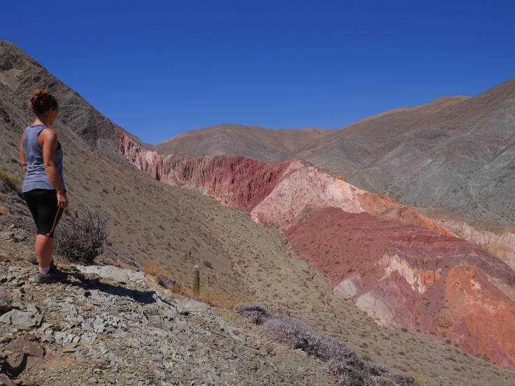 Autrement dit, une éternité à l’allure que l’on a. Aller-retour, il nous aurait fallu au moins 2h30. Ça monte dure et Ria n’est pas au top de sa forme. Les glaces vanille/chocolat de Tilcara ont eu raison d’elle… 🙂 On réfléchit longuement et finalement on rebrousse chemin. On n’a pas envie de se dépêcher et faire la même erreur que la veille. Du coup, en faisant demi-tour maintenant, on peut prendre notre temps et profiter de la vue, qui est déjà vraiment superbe, et faire des photos.