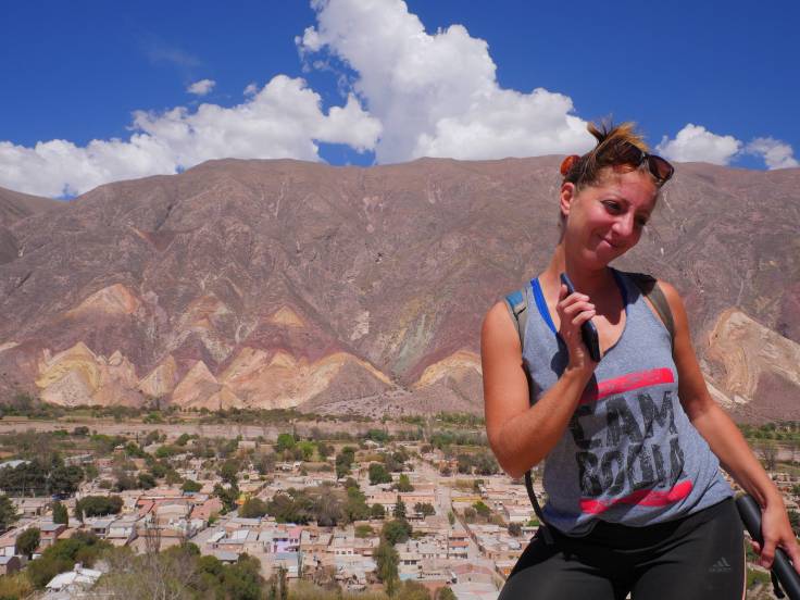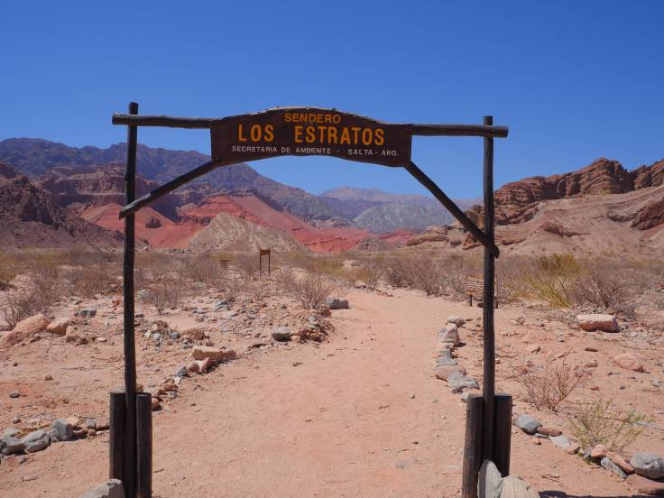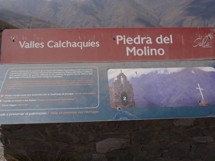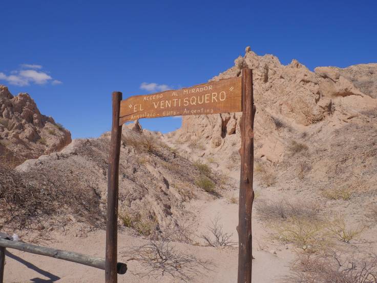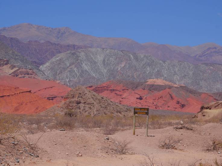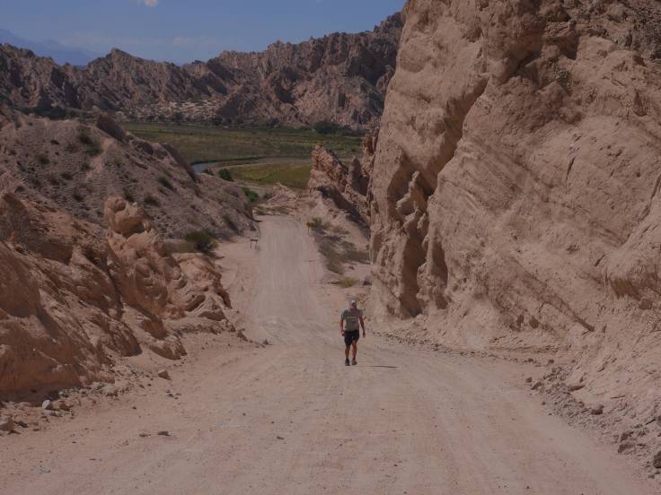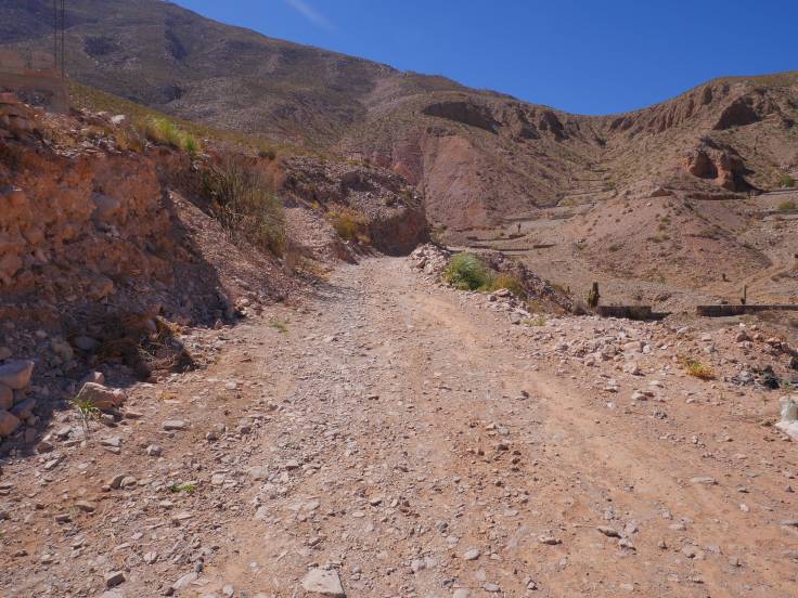 Une fois n’est pas coutume, on doit prendre un chemin de terre en piteux état pour y arriver. Du « parking », il y a 900m pour arriver au mirador… Ah non, Ria regarde mieux et en fait c’est plutôt 1.9km ! C’est plus la même histoire. On ne doit pas trop traîner car on doit ensuite aller à Humahuaca pour aller voir la montagne aux 14 couleurs, et il semblerait que le mieux soit d’y être entre 15h et 17h.