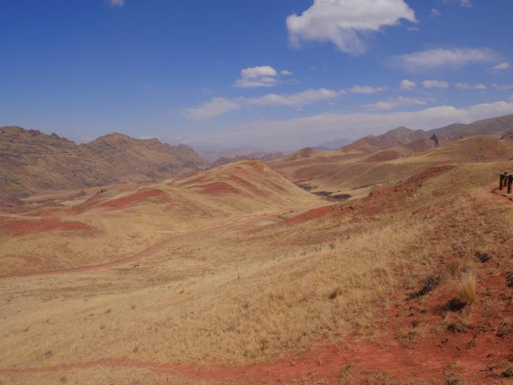 Le chemin de terre est vraiment galère, surtout aussi longtemps. Toujours faire attention aux gros cailloux, aux branches, etc… On profite beaucoup moins du paysage. C’était beaucoup plus facile en 4×4 en Australie ou au Chili ! Cependant, le trajet est passé assez vite grâce aux montagnes rouges qui tranchent avec le vert des arbres en contrebas et le ciel bleu.