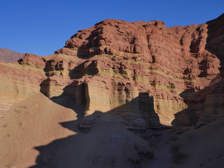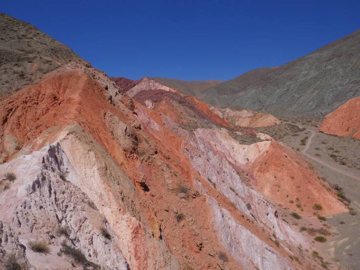 Le mirador Los Colorados, qui offre une vue sur la montagne aux 7 couleurs, est vraiment INCROYABLE ! La montagne dans toute sa splendeur. Des couleurs de partout ! Aussi beau que la veille à la Yesera, mais avec un vent de folie en plus. Cette chaîne de montagne a vu le jour il y a plus de 650 millions d’années, et avec l’érosion de différentes type de roches, est apparu ce décor tout droit sorti d’un dessin animé.