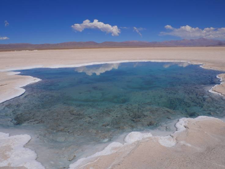 Une heure plus tard, on arrive dans une petite réplique du Salar de Uyuni et du Salar de Atacama. Du blanc partout entouré de montagnes.