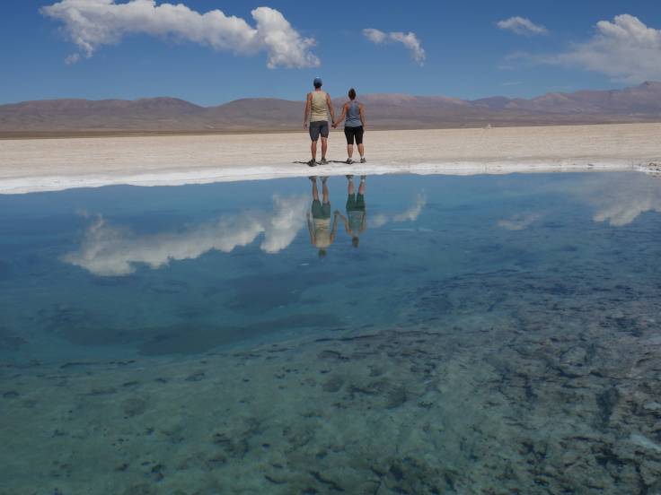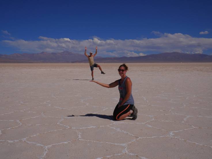 Il est nécessaire de prendre un guide pour aller voir les Salinas Grandes, et c’est 300 pesos. Pas cher du tout mais avec cette histoire d’hôtel que l’on a payé en espèce, il ne nous reste plus que 350 pesos, et si on veut acheter de l’eau ou autre on ne pourra pas. On réfléchit et finalement on arrive à trouver un couple d’argentin pour partager les frais. Marcelia et Edouardo nous invite dans leur voiture, et nous voilà partis, avec le guide, à travers le désert de sel.
