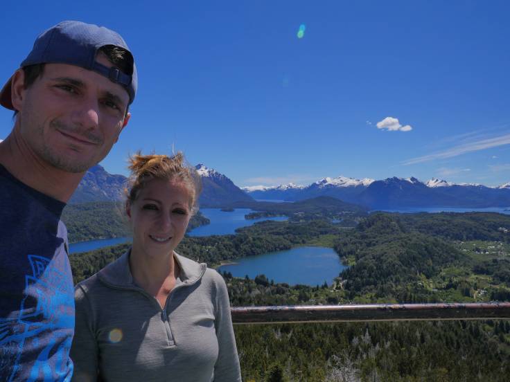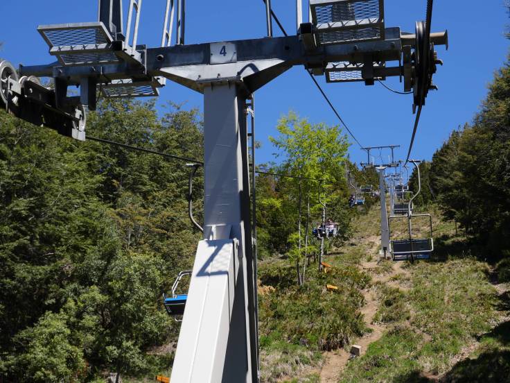 Après avoir eu de justesse le bus de retour, on a fait une halte au Cerro Campanario. Pour y monter, on avait le choix : soit télésiège soit à pied. Après 4h à marcher, plus une légère douleur à la cheville pour moi, on était plutôt partant pour la facilité. Ça fait bizarre de prendre un télésiège sans neige et sans ski :-).