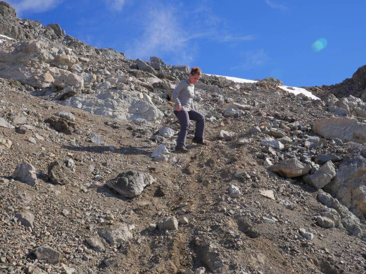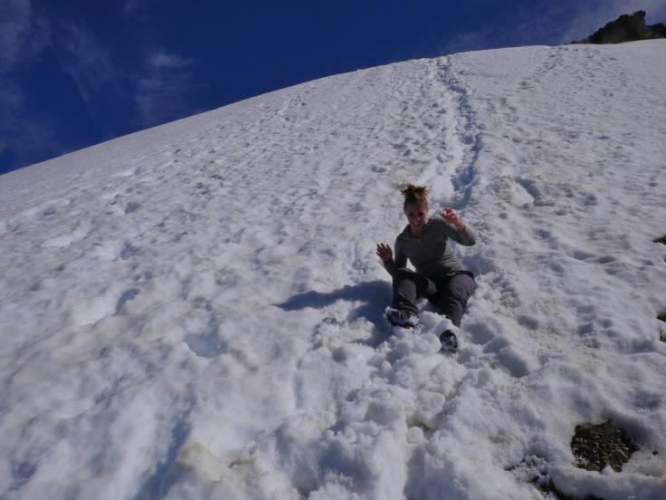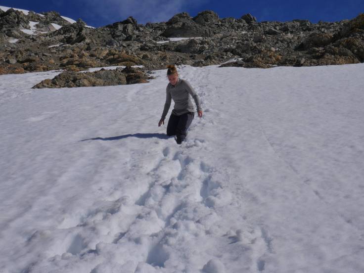 Bon, c’est pas tout mais maintenant il faut redescendre. Il est 17h et on ne va pas dormir là. Avec le terrain glissant de cailloux et de terre, et également de neige, ce fût loin d’être une partie de plaisir pour Ria. Elle faisait un peu comme au ski : du chasse-neige ou glissades contrôlées :-). Moi de mon côté, je courais dans la neige voir même surfait dessus ! Pour au final, l’attendre en bas. 🙂 Mais c’était top. Enfin sauf pour nos chaussures qui devaient beaucoup plus souffrir 🙂