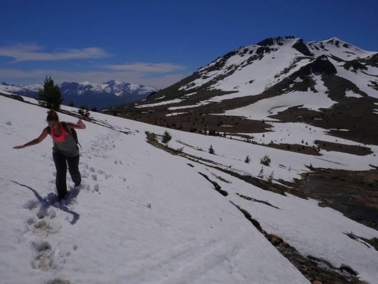 Après 1h de montée, on atteint le premier pallier, où l’on doit traverser quelques portions de neige, et profiter d’une vue sur les montagnes qui sont si belles. Ça rafraîchit !!! On ne le savait pas encore mais c’est à partir de ce moment que l’ascension a vraiment commencé à être difficile… GLOUPS !!! En plus de la neige, il y avait pas mal de cailloux qui rendaient la montée glissante. Heureusement que le sentier était bien balisé sinon on se serait déjà perdu ! C’était vraiment pentu et Ria soufflait comme un bœuf qui avait fait un marathon. Et puis elle parlait de temps en temps entre deux essoufflements : « j’en peux plus« , « j’ai mal partout« , « on arrive quand« . Assez drôle 🙂 Elle profitait de quelques pauses pour s’étirer un peu… 🙂