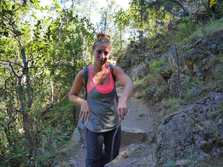 Du coup, nous revoilà repartis dans l’autre sens, et toujours dans la forêt. Le chemin n’est en plus pas toujours des plus facile avec les nombreux passages caillouteux. « Promenons-nous dans les bois pendant que le paysage n’y est pas… « . En tout cas, cette absence de paysage à fait tourner la tête de Ria, qui s’est mis à danser 🙂