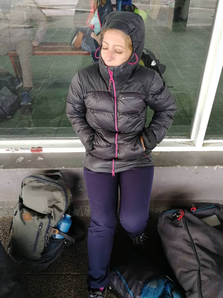 Après un long, long, long trajet en bus depuis Bariloche, on arrive enfin à El Calafate. A Bariloche on aura attendu le bus plus d’une heure dans le froid. Mais bordel qu’est-ce qu’il foutait ?!?!?! Du coup, Ria s’est endormi dehors… 🙂