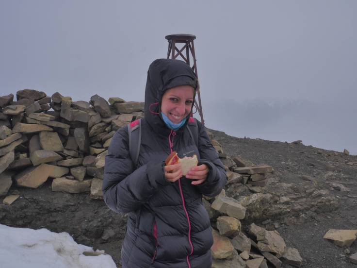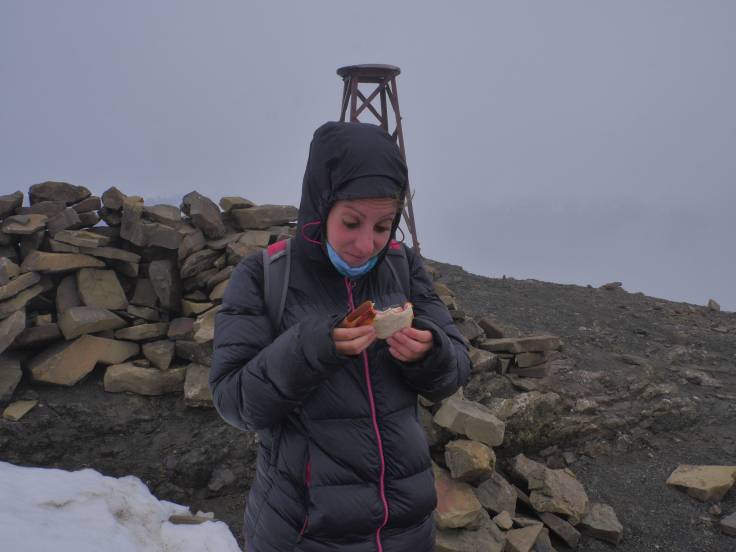 Cependant, cela sera de courte durée. Juste le temps de prendre quelques photos et les nuages reprennent le dessus. Un brouillard quasiment total qui permet à Ria de reprendre quelques forces avec un excellentissime sandwich pain de mie / saucisson. On patientera bien 30min en espérant avoir quelques éclaircies. En vain. Du coup, c’est parti pour le chemin retour, et bizarrement Ria va un peu plus vite.