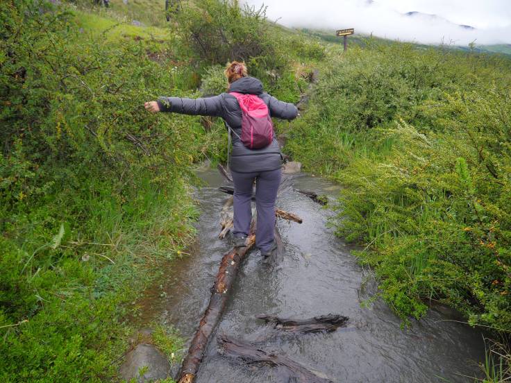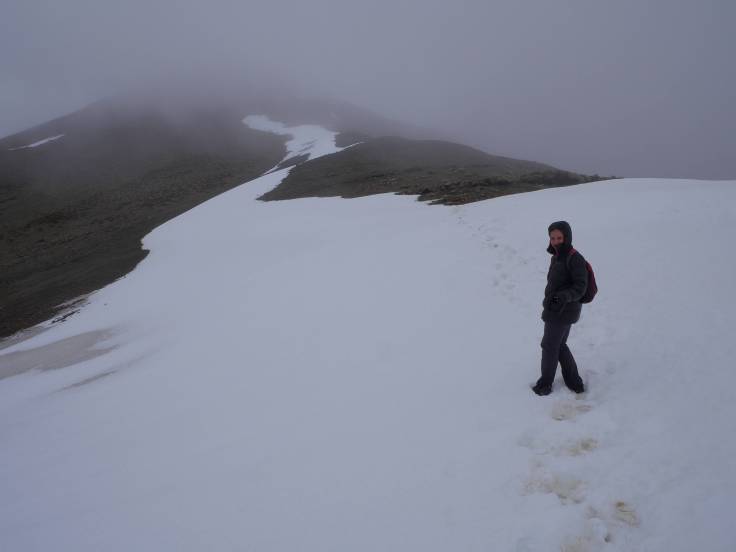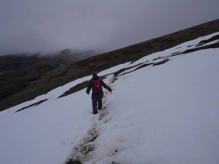 Une fois la partie zigzag terminée, on attaque une portion beaucoup plus raide. D’ailleurs Ria l’a bien remarqué… 🙂 On continue notre ascension pour atteindre les premières portions de neige. L’occasion de faire quelques batailles avec Ria, que bien évidemment elle perdra :-). Aux bons souvenirs de la randonnée à El Bolson, Cerro Piltriquitron. Les nuages sont de plus en plus denses et on a même le droit à quelques gouttes de pluie et, un peu plus tard, quelques flocons de neige. La visibilité est réduite et on ne distingue même plus les montagnes qui nous entourent. Les derniers hectomètres sont plus pentus et un peu plus glissants, non pas à cause de la neige mais de la terre et des cailloux.