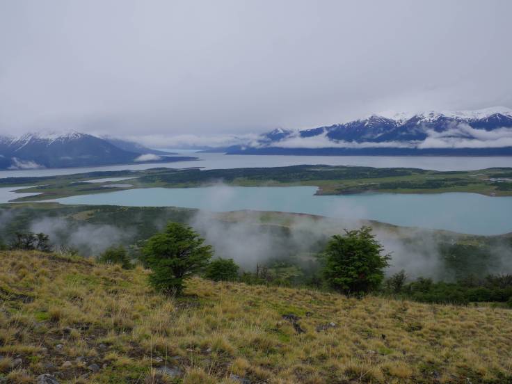 Le sentier commence par un long long long zigzag qui nous offre un splendide panorama sur le Lago Roca et également, au loin, sur le Perito Moreno. On a prévu de le faire demain mais on peut déjà voir qu’il est impressionnant d’aussi loin (20km à vol d’oiseau). On a de la chance car le ciel est nuageux mais nous permet tout de même de voir le paysage.
