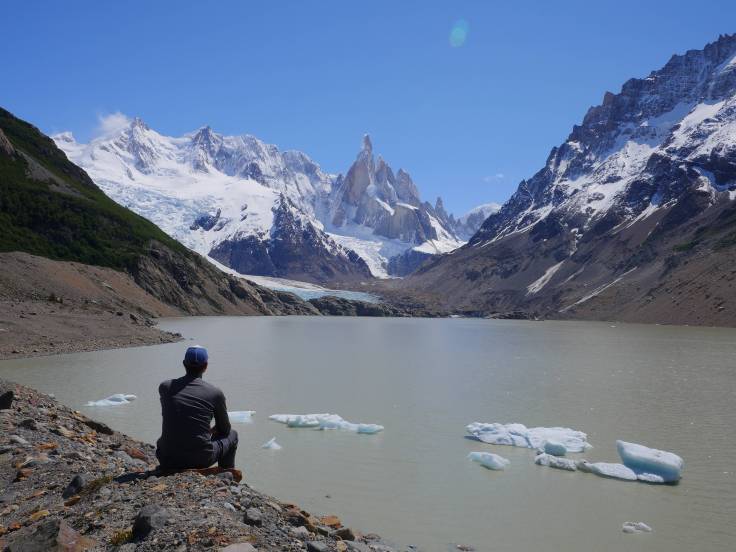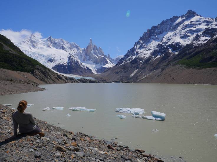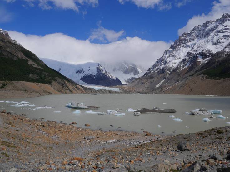 C’est après 2h30 que l’on arrivera à la Laguna Torre. Le Cerro Torre, qui culmine à 3102m d’altitude, est toujours sous les nuages mais le reste est dégagé et c’est vraiment très beau ! Une petite pause déjeuner bien méritée, avec toujours un peu de vent frais. Et quoi de mieux qu’un bon sandwich pain de mie / saucisson en profitant de la superbe vue ? 🙂
