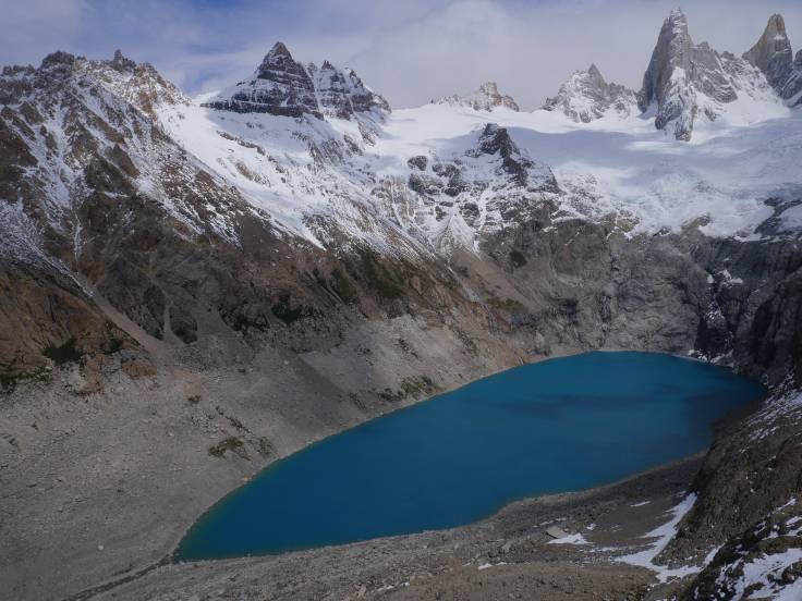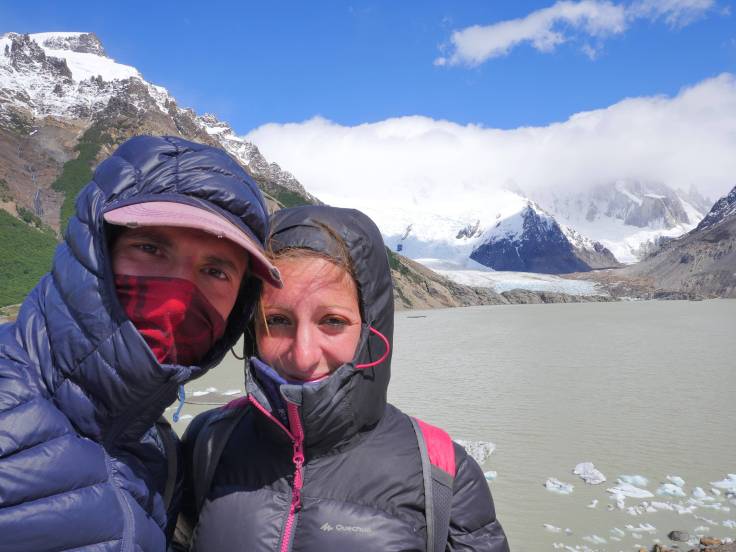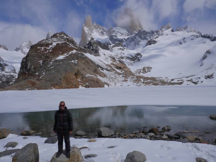 3h de marche après notre départ, nous voilà devant un monstre : le Fitz Roy !! Enfin presque car malheureusement un satané nuage est scotché sur le haut de la montagne. Cela ne nous empêche pas de profiter pleinement du paysage, de la Laguna Sucia, qui est bleu foncée, et de nos super sandwichs pain de mie / saucisson. Vraiment INCROYABLE et MAGNIFIQUE cet endroit. Il y a beaucoup de vent, parfois froid, mais pas aussi désagréable que ça. Également pas mal de monde mais heureusement le site est suffisamment grand pour ne pas qu’on se marche dessus.