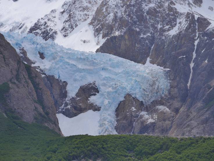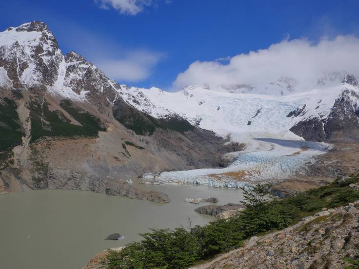 Après avoir bien mangé, gloups, on marchera un peu plus loin, 2km, pour rejoindre le mirador Maestri, qui nous permet d’avoir une vue sur le glacier. Moins impressionnant que le Perito Moreno mais tout de même imposant. La vue d’ici avec le glacier, le Cerro Torre, même sous les nuages et la Laguna Torre est vraiment top !!!