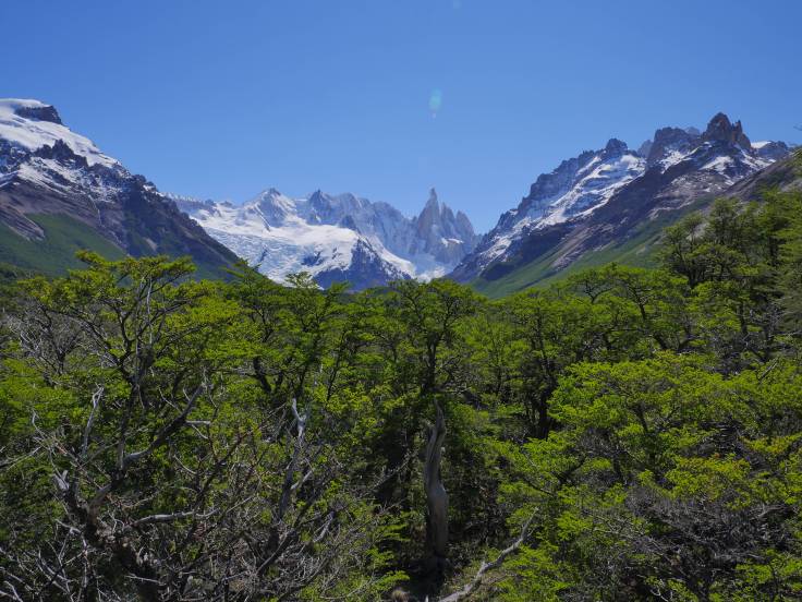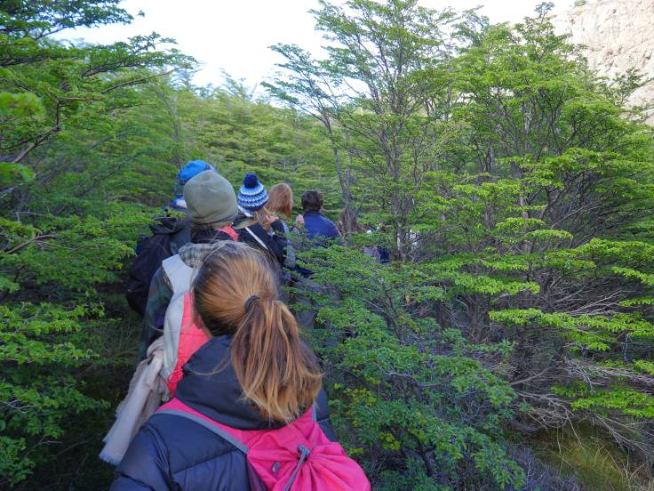 Première impression : il y a du monde ! Enfin, non pardon, c’est BLINDÉ ! On ne pensait pas qu’il y aurait autant de gens et de groupes. Le début est une montée d’environ 3km, sans difficulté ou presque, dans la forêt, où on peut s’arrêter sur plusieurs points de vue qui donnent sur la vallée. Malgré le ciel dégagé, le Fitz Roy est légèrement sous les nuages.