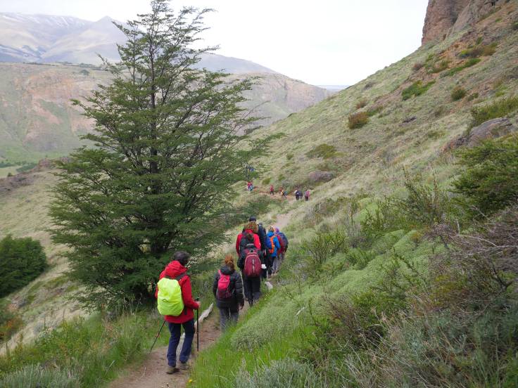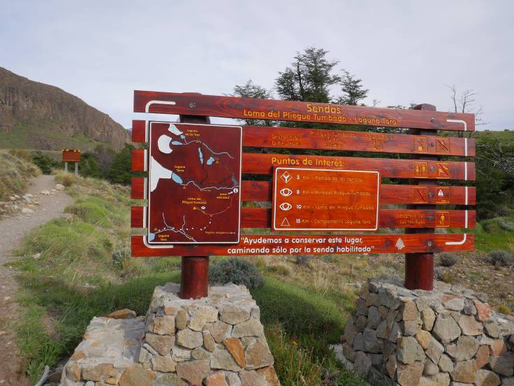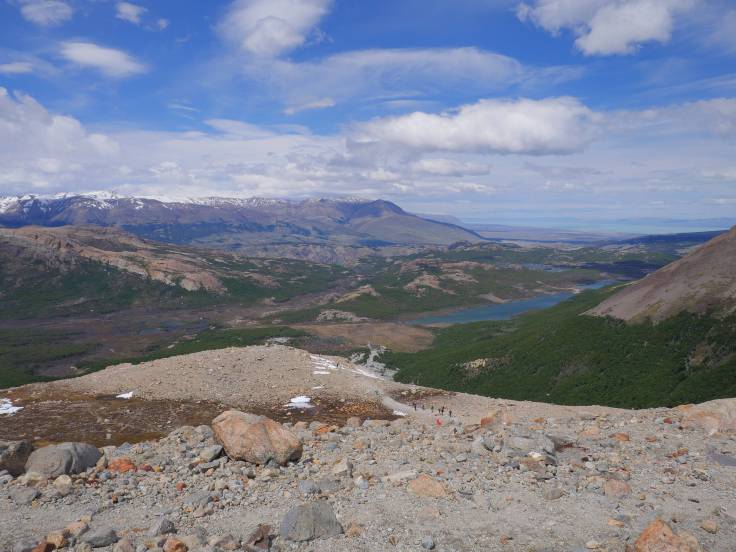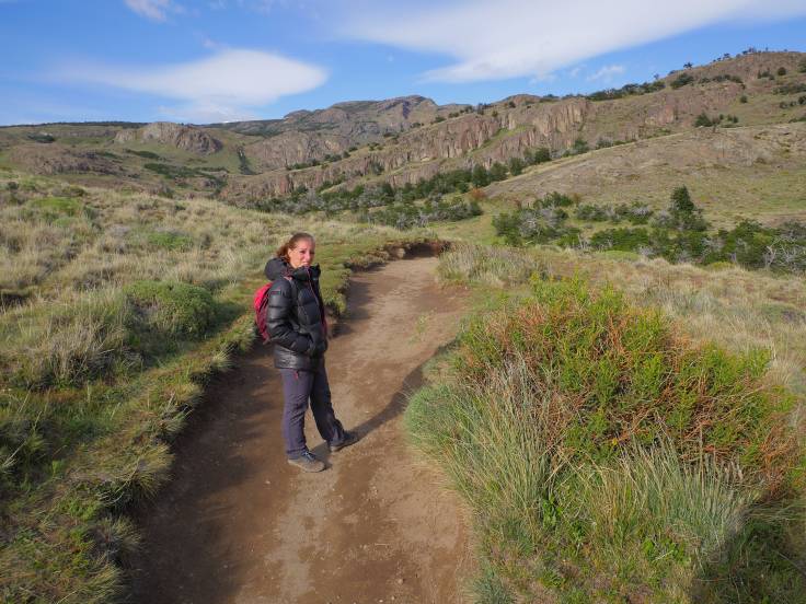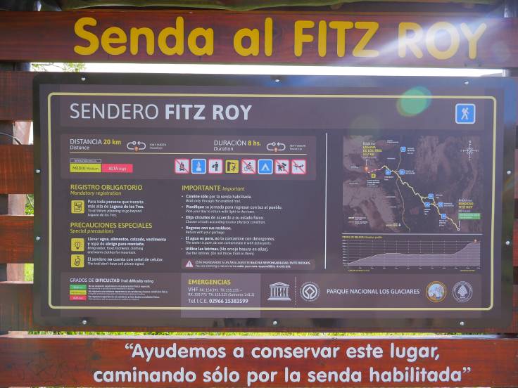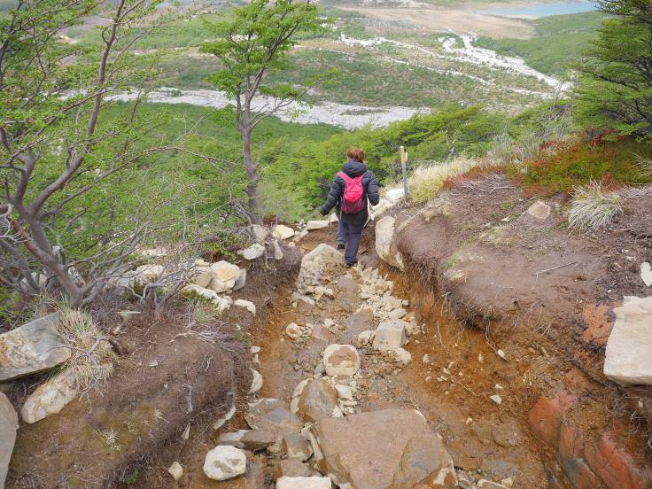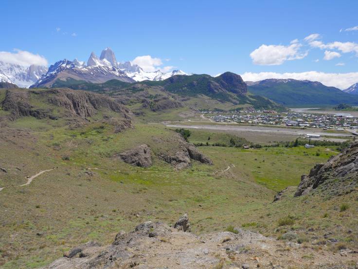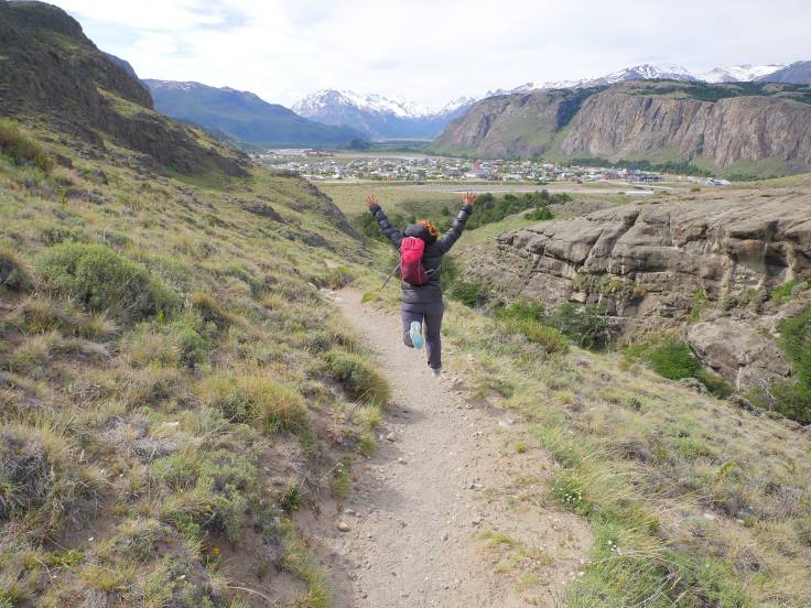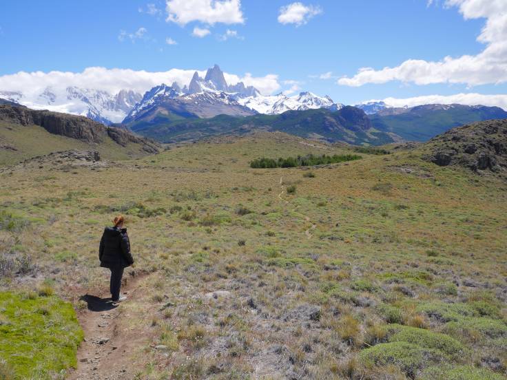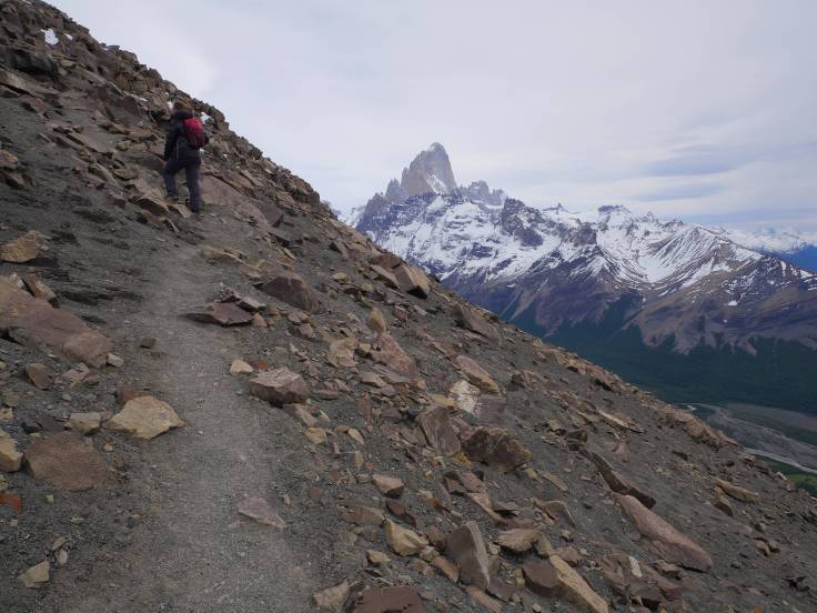 Le sentier est simple et monte légèrement en continu, sans difficulté. On s’arrêtera d’abord au mirador Los Condores, d’où on a une vue sur la ville et la chaîne de montagnes, avec bien évidemment le Fitz Roy, presque dégagé, et le Cerro Torre, complètement sous les nuages.