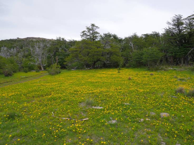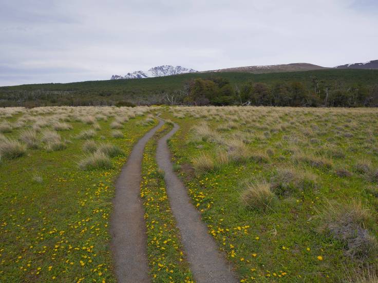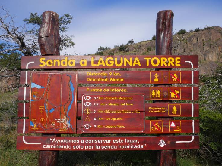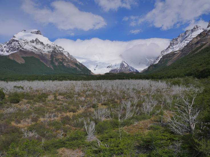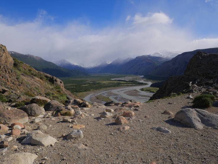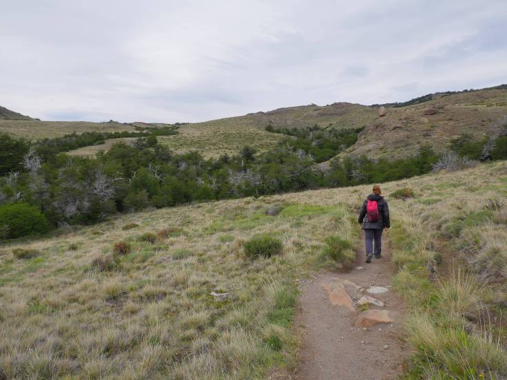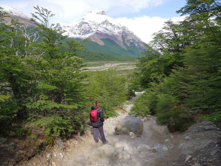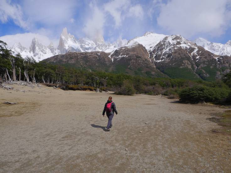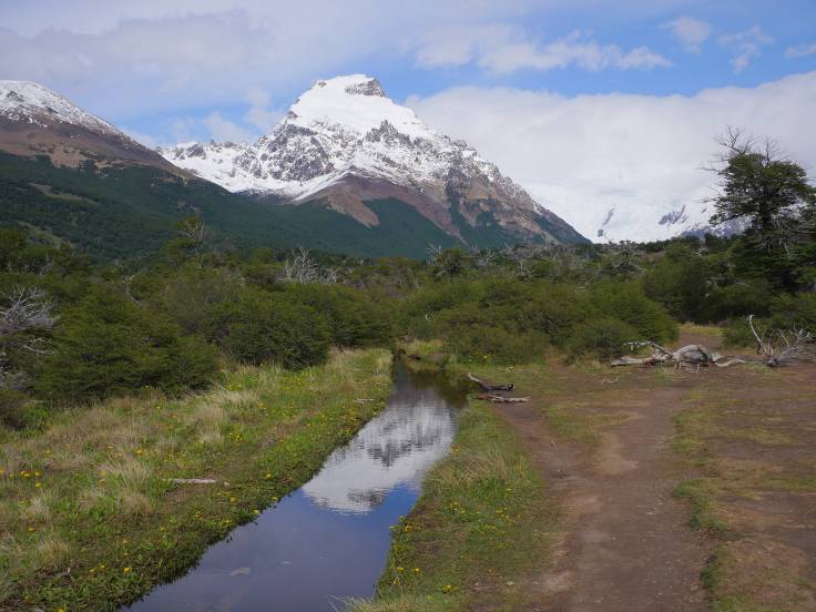 Le chemin est vallonné, en forêt, pendant environ 3km, mais sans grande difficulté. Ensuite, c’est plat, plat, plat dans les plaines, mais avec une vue sur le Cerro Torre. Enfin presque car il y a des satanés nuages juste dessus qui ne veulent pas bouger d’un pouce.