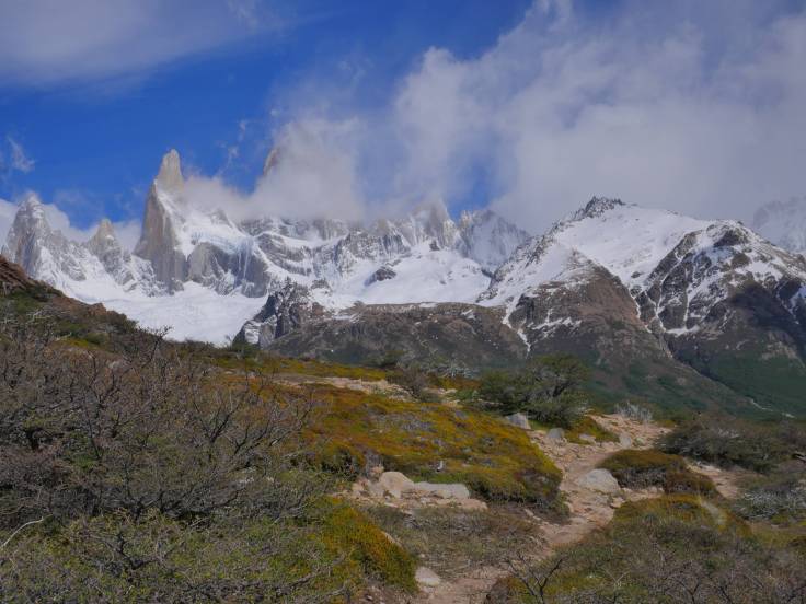 C’est beau mais cela reste largement en dessous de ce qu’on a pu voir ces derniers jours. Sur le chemin du retour, on a pu voir le Fitz Roy complètement dégagé. Gloups. Bah tant pis, on l’aura tout de même vu de loin. Mais on ne regrette pas trop notre choix car Ria a mal aux pieds, et ce n’est pas certain qu’elle aurait pu marcher 6h ou 7h.