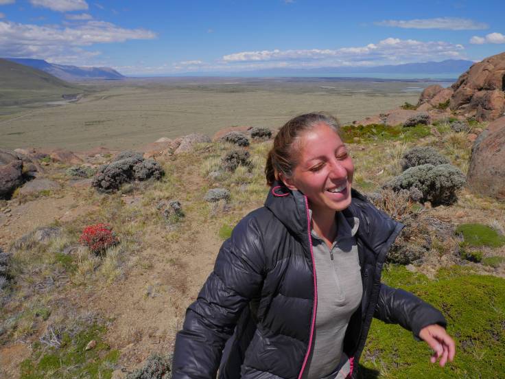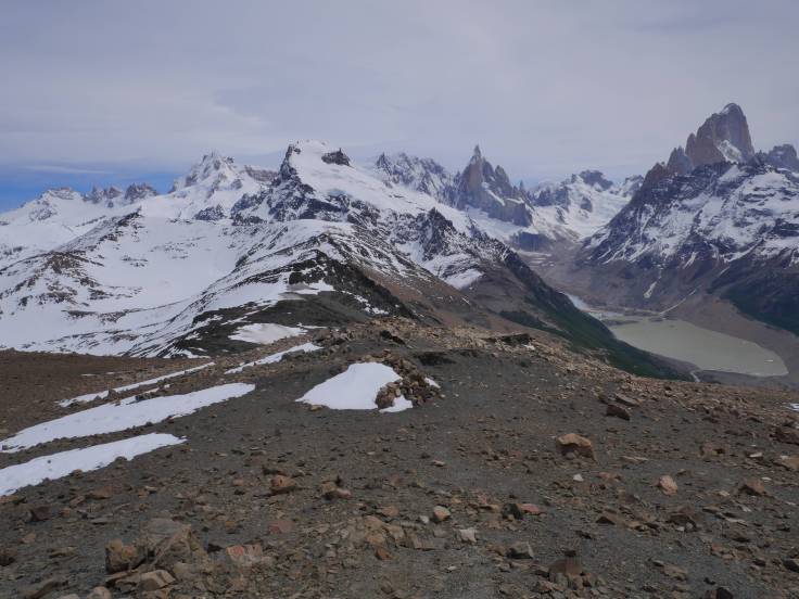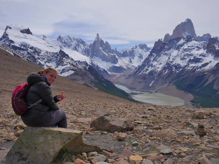 Cependant, la vue en vaut vraiment la chandelle !! En plus de voir le Fitz Roy et le Cerro Torre, on peut également avoir une vue sur la chaîne de montagnes et le lac Viedma. Vraiment génial comme endroit et bizarrement il n’y a presque personne. Tant mieux pour nous. On restera bien deux heures à prendre des photos, profiter du paysage et surtout reprendre des forces grâce à un sandwich incroyable venu d’une autre planète : le pain de mie / saucisson. On en profitera pour discuter avec un français Romain et deux belges Amandine et Zoé et faire plus ample connaissance.